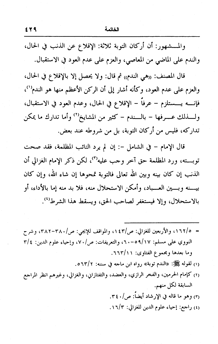 = ٥/ ١٦٢، والأربعين للغزالي: ص/ ١٤٣، والمواقف للإيجي: ص/ ٣٨٠ - ٣٨٢، وشرح النووي على مسلم: ١٧/ ٥٩ - ٦٠، والتعريفات: ص ٧٠١، وإحياء علوم الدين: ٣/ ٤ وما بعدها ومجموع الفتاوى: ١١/ ٦٦٣.