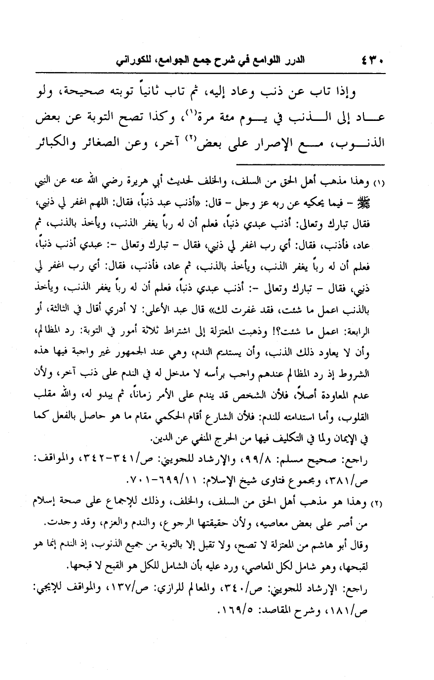 (٢) وهذا هو مذهب أهل الحق من السلف، والخلف، وذلك للإجماع على صحة إسلام من أصر على بعض معاصيه، ولأن حقيقتها الرجوع، والندم والعزم، وقد وجدت.