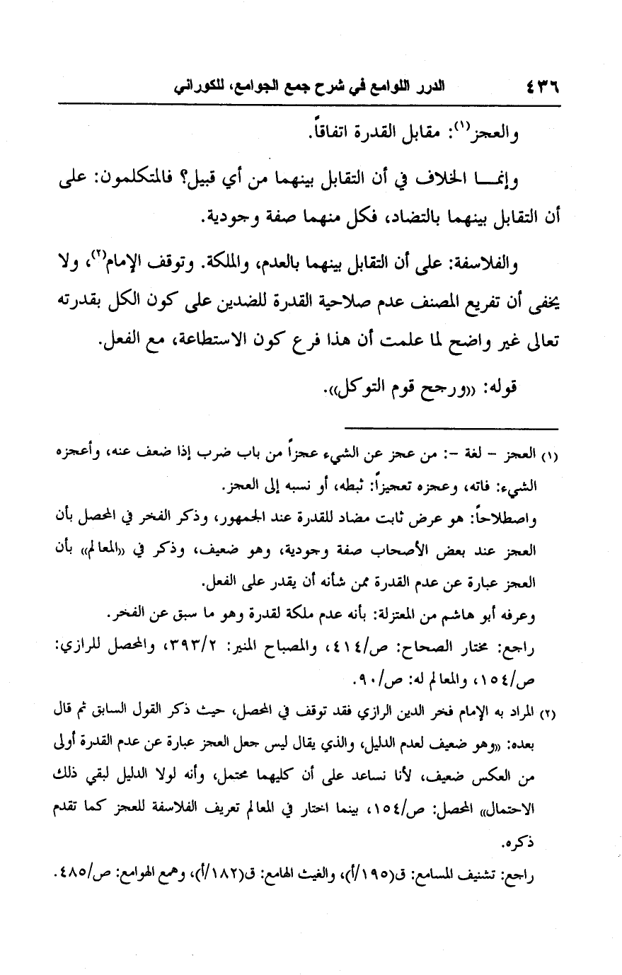 (٢) المراد به الإمام فخر الدين الرازي فقد توقف في المحصل، حيث ذكر القول السابق ثم قال بعده: "وهو ضعيف لعدم الدليل، والذي يقال ليس جعل العجز عبارة عن عدم القدرة أولى من العكس ضعيف، لأنا نساعد على أن كليهما محتمل، وأنه لولا الدليل لبقي ذلك الاحتمال" المحصل: ص/ ١٥٤، بينما اختار في المعالم تعريف الفلاسفة للعجز كما تقدم ذكره.