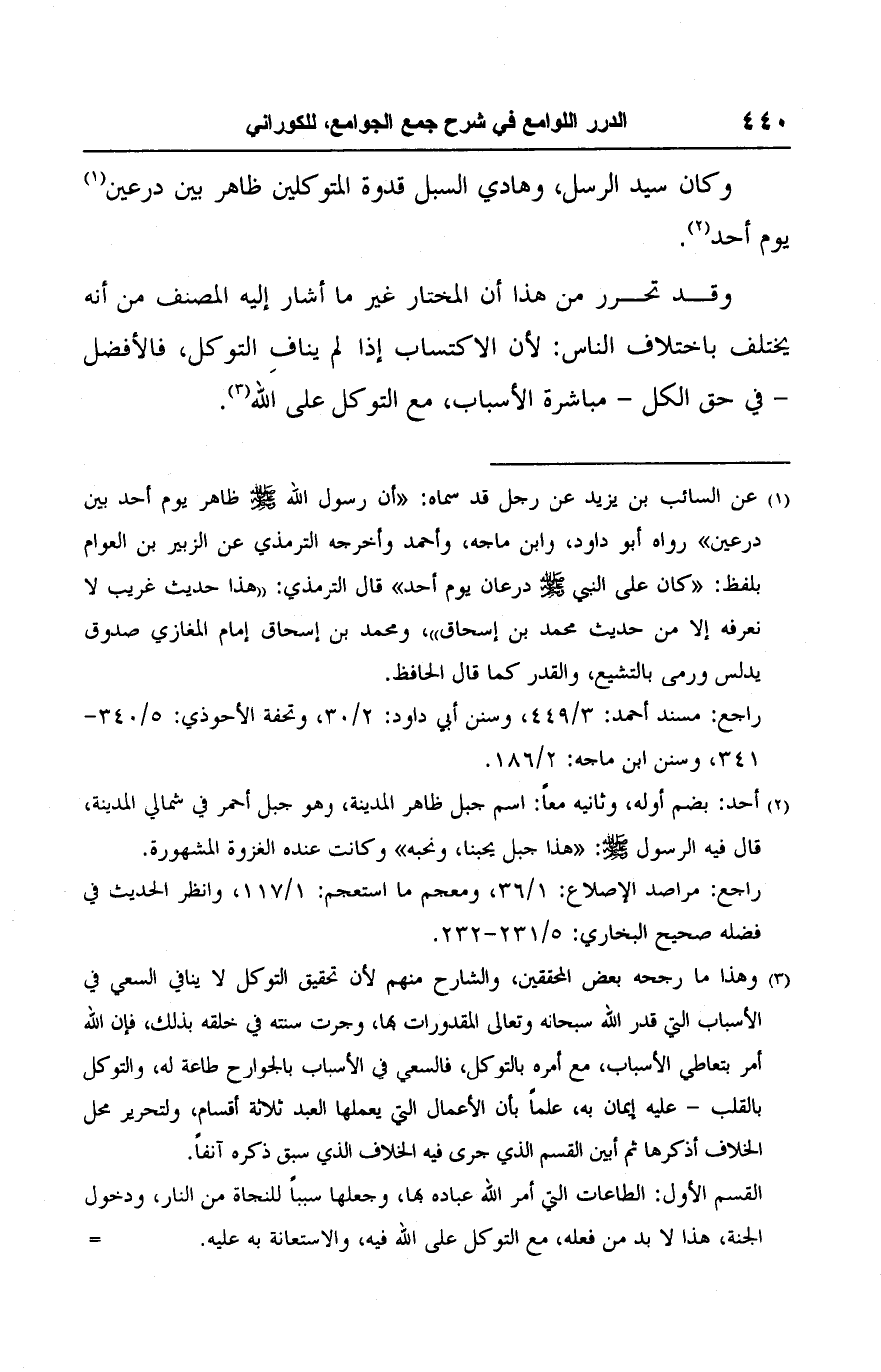 (٣) وهذا ما رجحه بعض المحققين، والشارح منهم لأن تحقيق التوكل لا ينافي السعي في الأسباب التي قدر اللَّه سبحانه وتعالى المقدورات بها، وجرت سنته في خلقه بذلك، فإن اللَّه أمر بتعاطي الأسباب، مع أمره بالتوكل، فالسعي في الأسباب بالجوارح طاعة له، والتوكل بالقلب - عليه إيمان به، علمًا بأن الأعمال التي يعملها العبد ثلاثة أقسام، ولتحرير محل الخلاف أذكرها ثم أبين القسم الذي جرى فيه الخلاف الذي سبق ذكره آنفًا.