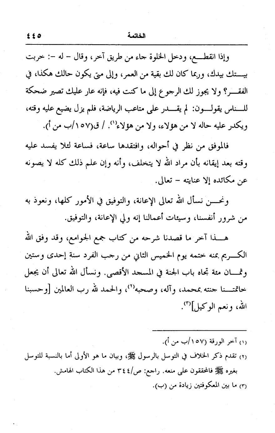 هذا آخر ما قصدنا شرحه من كتاب جمع الجوامع، وقد وفق اللَّه الكريمة بمنة ختمه يوم الخميس الثاني من رجب الفرد سنة إحدى وستين وثمان مئة تجاه باب الجنة في المسجد الأقصى. ونسأل اللَّه تعالى أن يجعل خاتمتنا جنته بمحمد، وآله، وصحبه (٢)، والحمد للَّه رب العالمين [وحسبنا اللَّه، ونعم الوكيل] (٣).