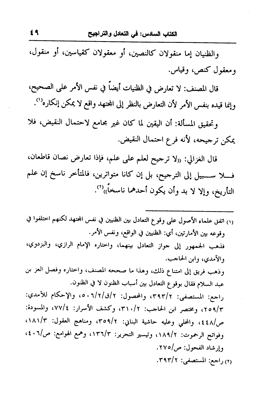 (١) اتفق علماء الأصول على وقوع التعادل بين الظنيين في نفس المجتهد لكنهم اختلفوا في وقوعه بين الأمارتين، أي: الظنيين في الواقع، ونفس الأمر.