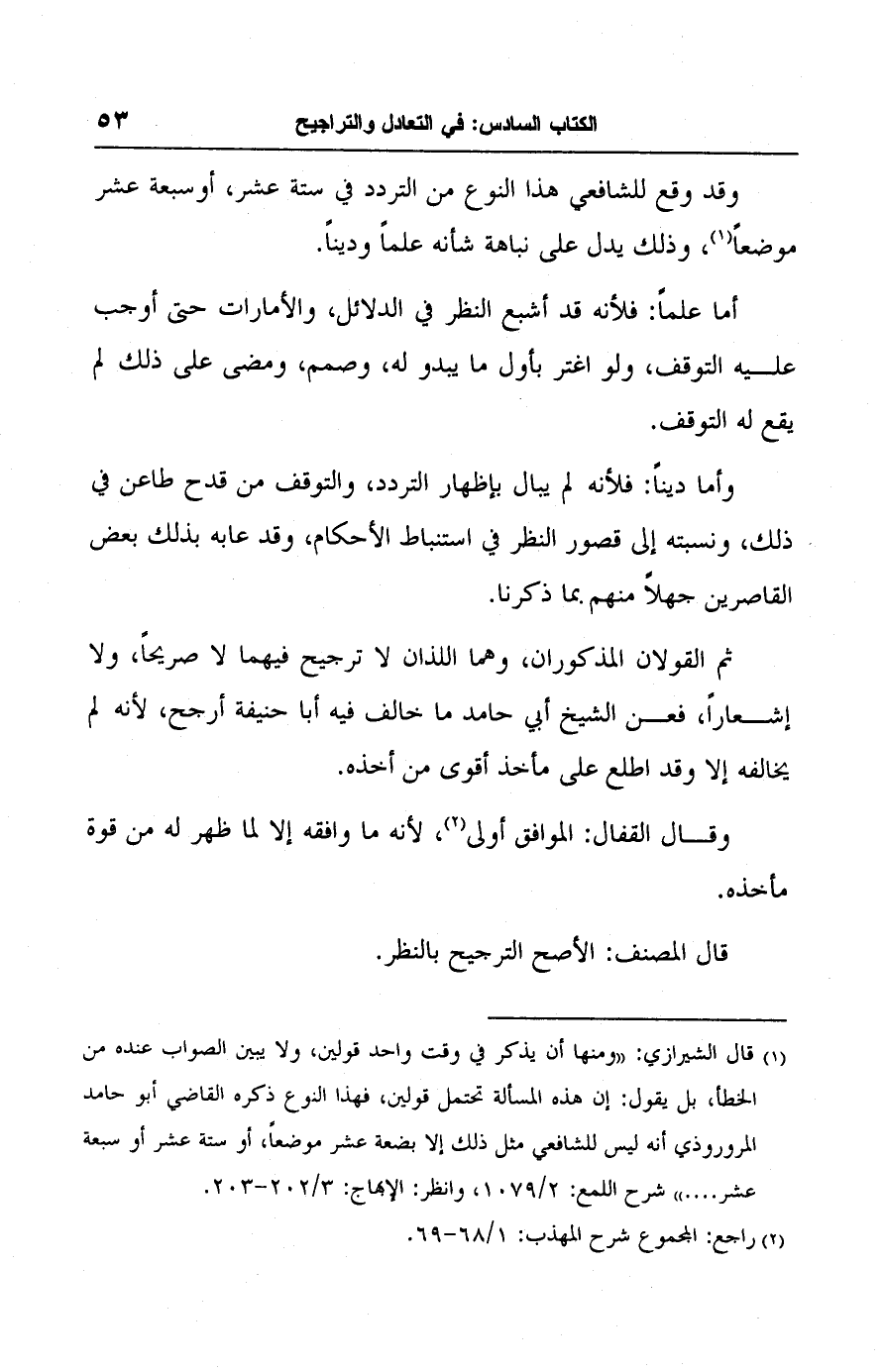 ثم القولان المذكوران، وهما اللذان لا ترجيح فيهما لا صريحًا، ولا إشعارًا، فعن الشيخ أبي حامد ما خالف فيه أبا حنيفة أرجح؛ لأنه لم يخالفه إلا وقد اطلع على مأخذ أقوى من أخذه.
