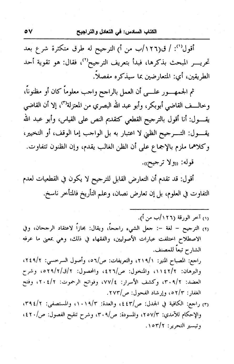 ثم الجمهور على أن العمل بالراجح واجب معلومًا كان أو مظنونًا، وخالف القاضي أبو بكر، وأبو عبد اللَّه البصرى من المعتزلة (٣)، إلا أن القاضي يقول: أنا أقول بالترجيح القطعي كتقديم النص على القياس، وأبو عبد اللَّه يقول: الترجيح الظني لا اعتبار به بل الواجب إما الوقف، أو التخيير، وكلاهما ملزم بالاجماع على أن الظن الغالب يقدم، وإن الظنون تتفاوت.