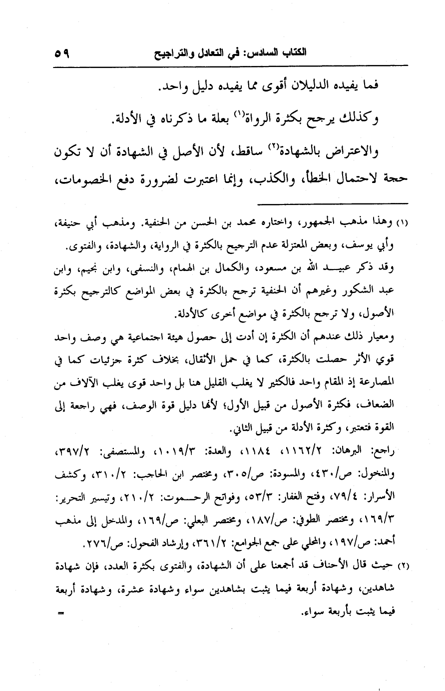 (١) وهذا مذهب الجمهور، واختاره محمد بن الحسن من الحنفية. ومذهب أبي حنيفة، وأبي يوسف، وبعض المعتزلة عدم الترجيح بالكثرة في الرواية، والشهادة، والفتوى.