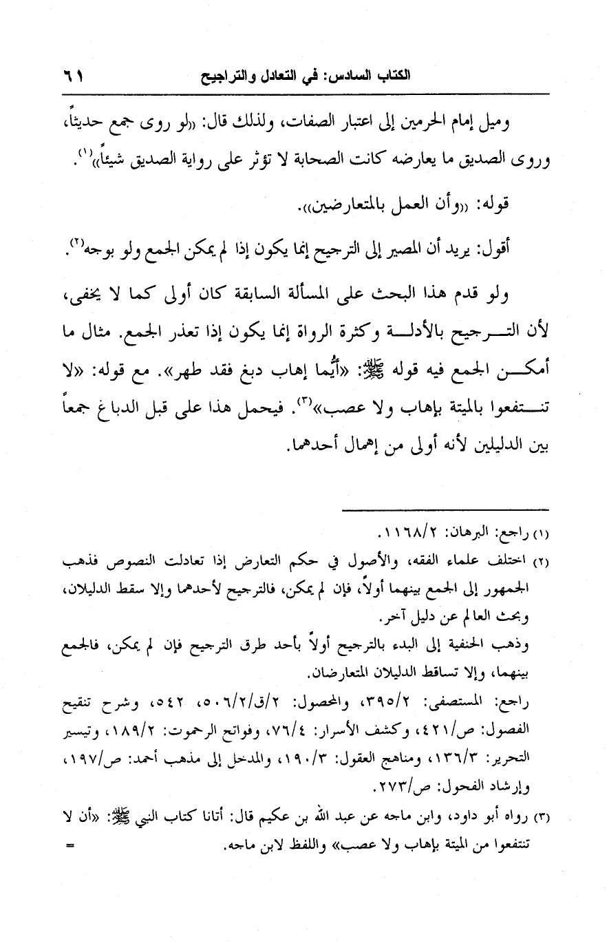 (٢) اختلف علماء الفقه، والأصول في حكم التعارض إذا تعادلت النصوص فذهب الجمهور إلى الجمع بينهما أولًا، فإن لم يمكن، فالترجيح لأحدهما وإلا سقط الدليلان، وبحث العالم عن دليل آخر.