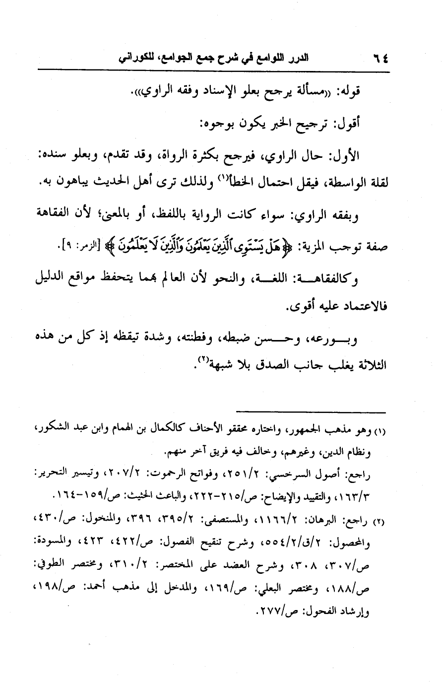 وبفقه الراوي: سواء كانت الرواية باللفظ، أو بالمعنى؛ لأن الفقاهة صفة توجب المزية: {هَلْ يَسْتَوِي الَّذِينَ يَعْلَمُونَ وَالَّذِينَ لَا يَعْلَمُونَ} [الزمر: ٩].