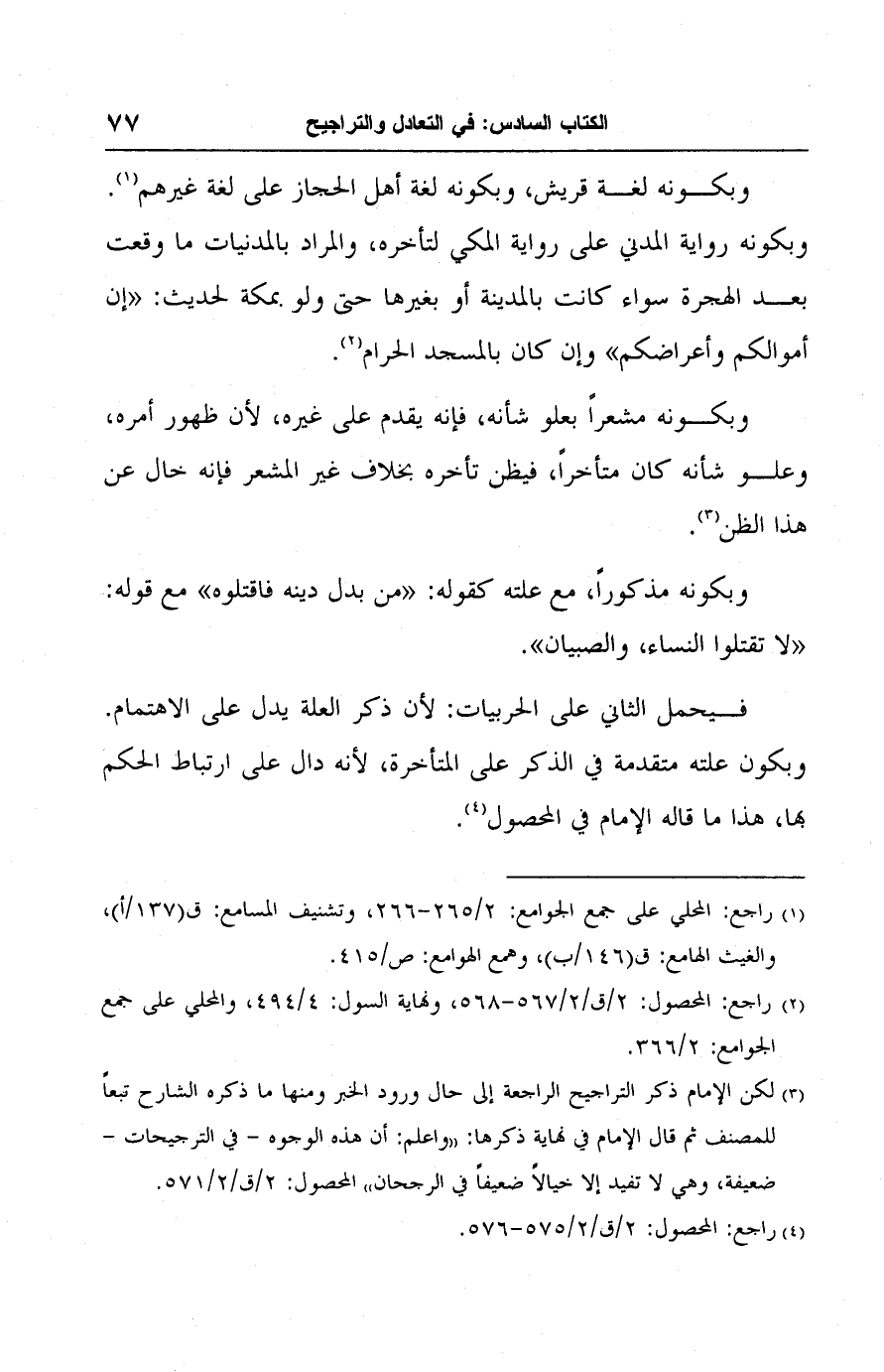 فيحمل الثاني على الحربيات: لأن ذكر العلة يدل على الاهتمام. وبكون علته متقدمة في الذكر على المتأخرة؛ لأنه دال على ارتباط الحكم بها، هذا ما قاله الإمام في المحصول (٤).
