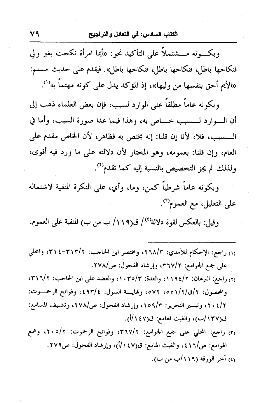 (٣) راجع: المحلي على جمع الجوامع: ٢/ ٣٦٧، وفواتح الرحموت: ٢/ ٢٠٥، وهمع الهوامع: ص/ ٤١٦، والغيث الهامع: ق (١٤٧/ أ)، وإرشاد الفحول: ص ٢٧٩.