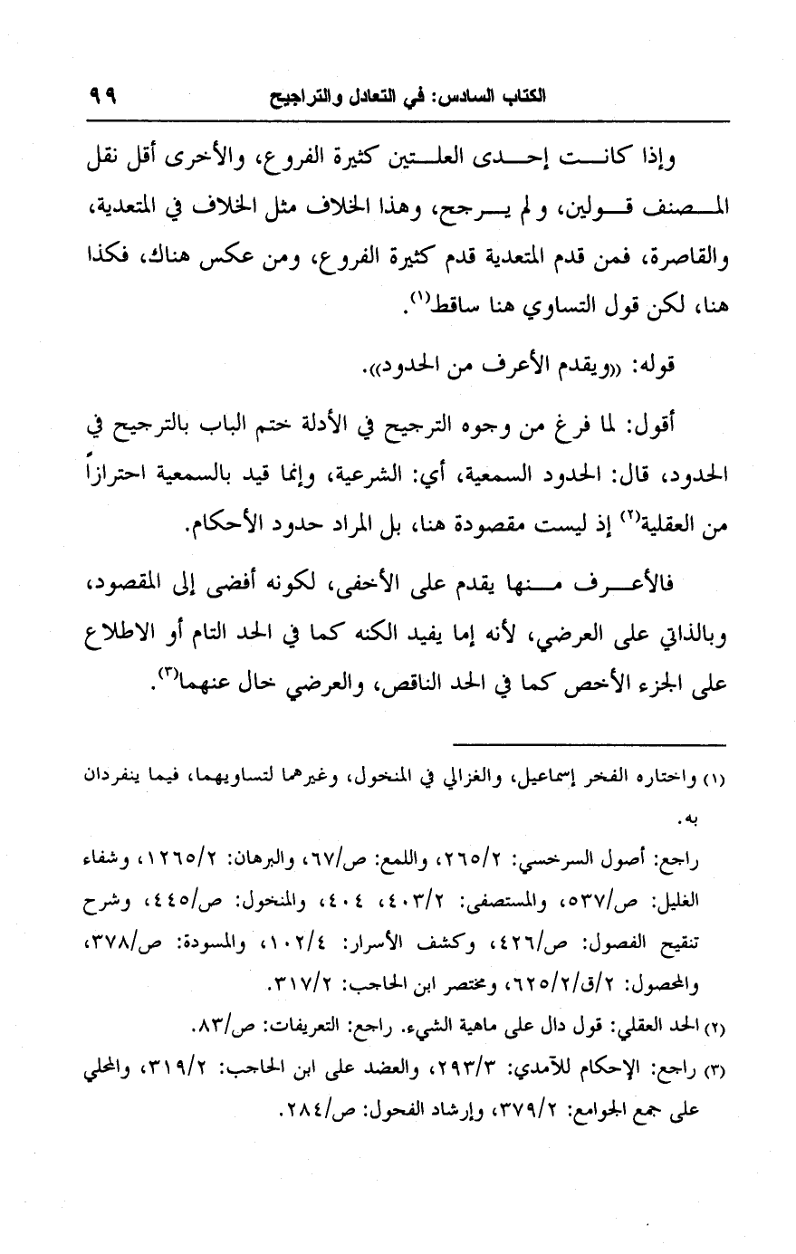 أقول: لما فرغ من وجوه الترجيح في الأدلة ختم الباب بالترجيح في الحدود، قال: الحدود السمعية، أي: الشرعية، وإنما قيد بالسمعية احترازًا من العقلية (٢) إذ ليست مقصودة هنا، بل المراد حدود الأحكام.