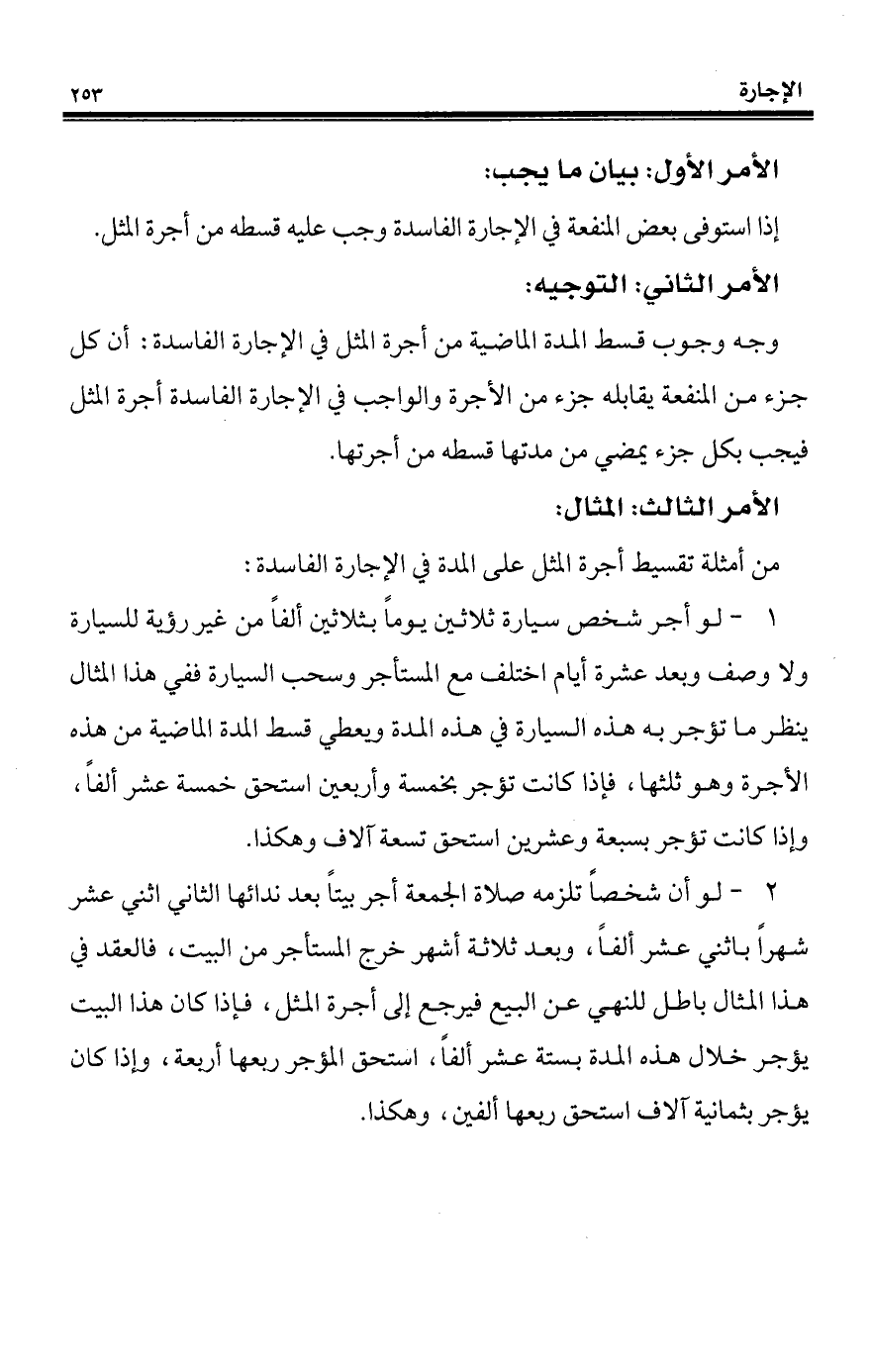 1 - لو أجر شخص سيارة ثلاثين يومًا بثلاثين ألفًا من غير رؤية للسيارة ولا وصف وبعد عشرة أيام اختلف مع المستأجر وسحب السيارة ففي هذا المثال ينظر ما تؤجر به هذه السيارة في هذه المدة ويعطي قسط المدة الماضية من هذه الأجرة وهو ثلثها، فإذا كانت تؤجر بخمسة وأربعين استحق خمسة عشر ألفًا، وإذا كانت تؤجر بسبعة وعشرين استحق تسعة آلاف وهكذا.