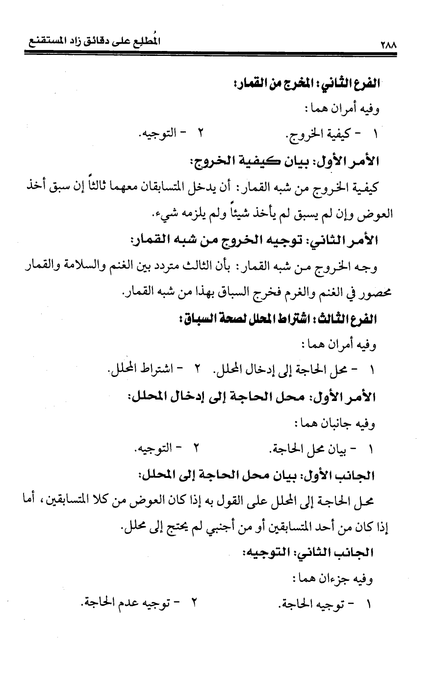 وجه الخروج من شبه القمار: بأن الثالث متردد بين الغنم والسلامة والقمار محصور في الغنم والغرم فخرج السباق بهذا من شبه القمار.