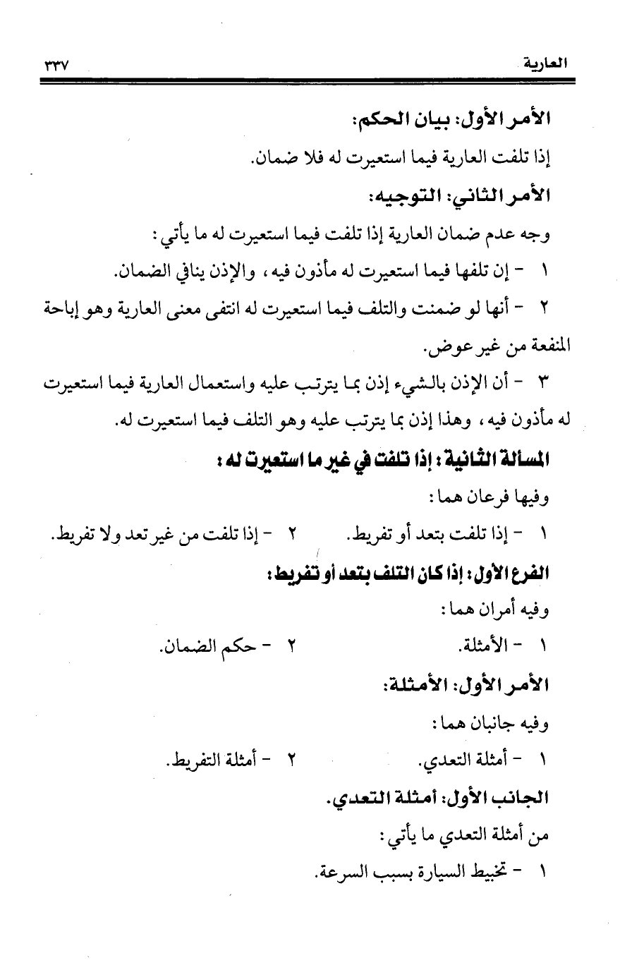 3 - أن الإذن بالشيء إذن بما يترتب عليه واستعمال العارية فيما استعيرت له مأذون فيه، وهذا إذن بما يترتب عليه وهو التلف فيما استعيرت له.