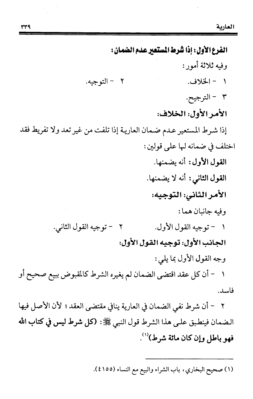 2 - أن شرط نفي الضمان في العارية ينافي مقتضى العقد؛ لأن الأصل فيها الضمان فينطبق على هذا الشرط قول النبي - صلى الله عليه وسلم -: (كل شرط ليس في كتاب الله فهو باطل وإن كان مائة شرط) (¬1).