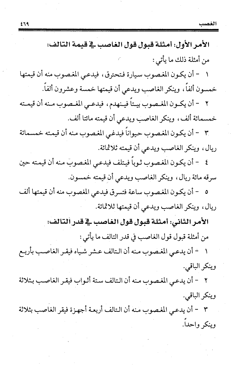 1 - أن يكون المغصوب سيارة فتحترق، فيدعي المغصوب منه أن قيمتها خمسون ألفاً، وينكر الغاصب ويدعي أن قيمتها خمسة وعشرون ألفاً.