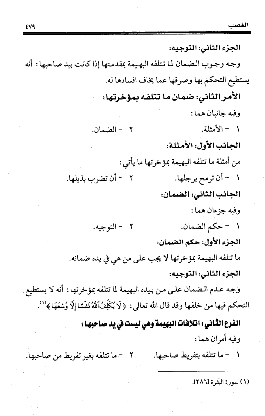 وجه عدم الضمان على من بيده البهيمة لما تتلفه بمؤخرتها: أنه لا يستطيع التحكم فيها من خلفها وقد قال الله تعالى: {لَا يُكَلِّفُ اللَّهُ نَفْسًا إِلَّا وُسْعَهَا} (¬1).