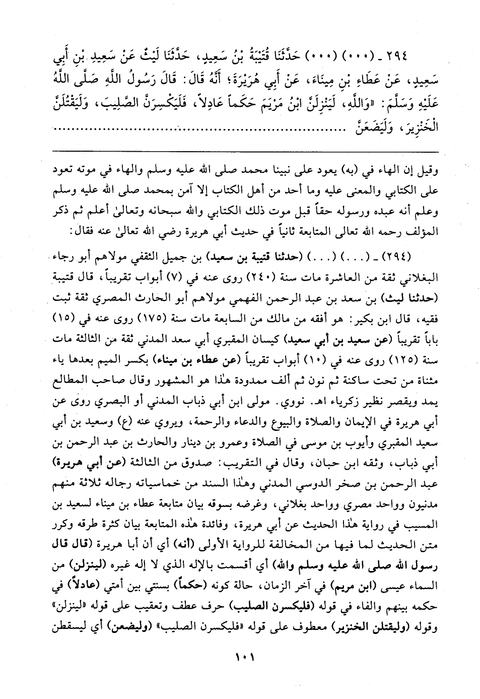 (٢٩٤) - (٠٠) (٠٠) (حدثنا قتيبة بن سعيد) بن جميل الثَّقَفيّ مولاهم أبو رجاء البغلاني ثِقَة من العاشرة مات سنة (٢٤٠) روى عنه في (٧) أبواب تقريبًا، قال قتيبة (حدثنا ليث) بن سعد بن عبد الرَّحْمَن الفهمي مولاهم أبو الحارث المصري ثِقَة ثبت فقيه، قال ابن بكير: هو أفقه من مالك من السابعة مات سنة (١٧٥) روى عنه في (١٥) بابًا تقريبًا (عن سعيد بن أبي سعيد) كيسان المقبري أبي سعد المدنِيُّ ثِقَة من الثالثة مات سنة (١٢٥) روى عنه في (١٠) أبواب تقريبًا (عن عطاء بن ميناء) بكسر الميم بعدها ياء مثناة من تحت ساكنة ثم نون ثم أَلف ممدودة هذا هو المشهور وقال صاحب المطالع يمد ويقصر نظير زكرياء اهـ. نووي. مولى ابن أبي ذباب المدنِيُّ أو البَصْرِيّ روى عن أبي هريرة في الإيمان والصلاة والبيوع والدعاء والرحمة، ويروي عنه (ع) وسعيد بن أبي سعيد المقبري وأيوب بن موسى في الصلاة وعمرو بن دينار والحارث بن عبد الرَّحْمَن بن أبي ذباب، وثقه ابن حبان، وقال في التقريب: صدوق من الثالثة (عن أبي هريرة) عبد الرَّحْمَن بن صخر الدوسي المدنِيُّ وهذا السند من خماسياته رجاله ثلاثة منهم مدنيون وواحد مصري وواحد بغلاني؛ وغرضه بسوقه بيان متابعة عطاء بن ميناء لسعيد بن المسيّب في رواية هذا الحديث عن أبي هريرة، وفائدة هذه المتابعة بيان كثرة طرقه وكرر متن الحديث لما فيها من المخالفة للرواية الأولى (أنَّه) أي أن أَبا هريرة (قال قال رسول الله صلى الله عليه وسلم والله) أي أقسمت بالإله الذي لا إله غيره (لينزلن) من السماء عيسى (ابن مريم) في آخر الزمان، حالة كونه (حكمًا) بسنتي بين أمتي (عادلًا) في حكمه بينهم والفاء في قوله (فليكسرن الصليب) حرف عطف وتعقيب على قوله "لينزلن" وقوله (وليقتلن الخنزير) معطوف على قوله "فليكسرن الصليب" (وليضعن) أي ليسقطن