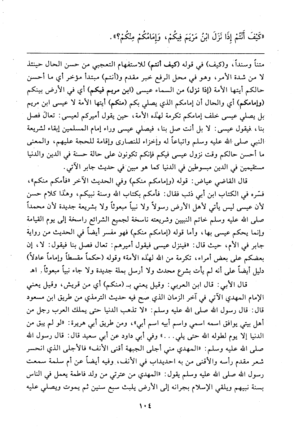 قال الأبي: قال ابن العربي: وقيل يعني بـ (منكم) أي من قريش، وقيل يعني الإِمام المهدي الآتي في آخر الزمان الذي صح فيه حديث التِّرْمِذِيّ من طريق ابن مسعود قال: قال رسول الله صلى الله عليه وسلم: "لا تذهب الدنيا حتَّى يملك العرب رجل من أهل بيتي يوافق اسمه اسمي واسم أَبيه اسم أبي"، ومن طريق أبي هريرة: "لو لم يبق من الدنيا إلَّا يوم لطوله الله حتَّى يلي ... " وفي أبي داود عن أبي سعيد قال: قال رسول الله صلى الله عليه وسلم: "المهدي مني أجلى الجبهة أقنى الأنف" فالأجلى الذي انحسر شعر مقدم رأسه والأقنى من به احديداب في الأنف، وفيه أَيضًا عن أم سلمة سمعت رسول الله صلى الله عليه وسلم يقول: "المهدي من عترتي من ولد فاطمة يعمل في النَّاس بسنة نبيهم ويلقي الإِسلام بجرانه إلى الأرض يلبث سبع سنين ثم يموت ويصلي عليه
