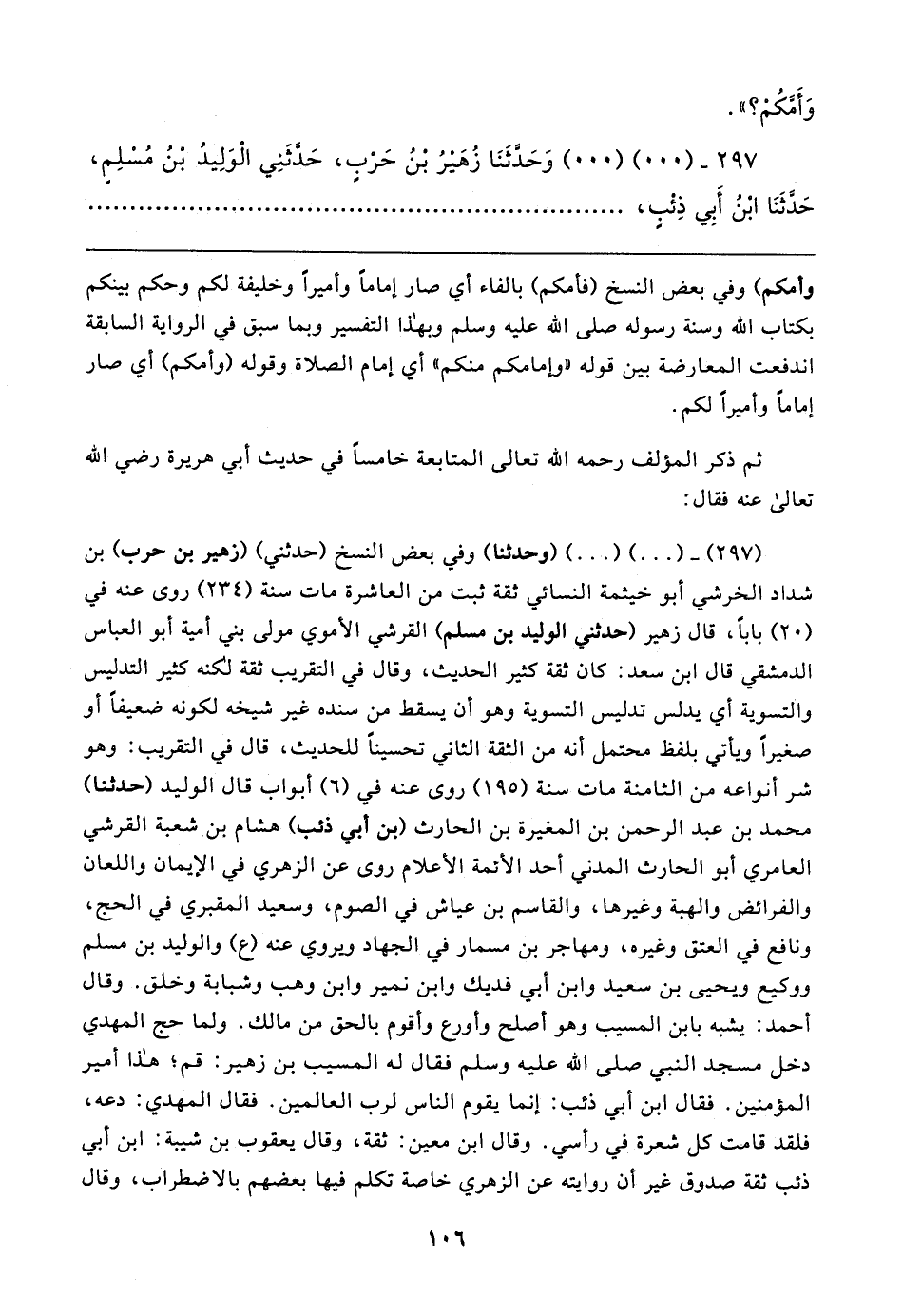 (٢٩٧) - (٠٠) (٠٠) (وحدثنا) وفي بعض النسخ (حَدَّثني) (زهير بن حرب) بن شداد الخرشي أبو خيثمة النَّسائيّ ثِقَة ثبت من العاشرة مات سنة (٢٣٤) روى عنه في (٢٠) بابا، قال زهير (حَدَّثني الوليد بن مسلم) القُرشيّ الأُموي مولى بني أمية أبو العباس الدِّمشقيّ قال ابن سعد: كان ثِقَة كثير الحديث، وقال في التقريب ثِقَة لكنه كثير التدليس والتسوية أي يدلس تدليس التسوية وهو أن يسقط من سنده غير شيخه لكونه ضعيفًا أو صغيرًا ويأتي بلفظ محتمل أنَّه من الثقة الثاني تحسينًا للحديث، قال في التقريب: وهو شر أنواعه من الثامنة مات سنة (١٩٥) روى عنه في (٦) أبواب قال الوليد (حَدَّثَنَا) محمَّد بن عبد الرَّحْمَن بن المغيرة بن الحارث (بن أبي ذئب) هشام بن شعبة القُرشيّ العامري أبو الحارث المدنِي أحد الأئمة الأعلام روى عن الزُّهْرِيّ في الإيمان واللعان والفرائض والهبة وغيرها، والقاسم بن عياش في الصوم، وسعيد المقبري في الحج، ونافع في العتق وغيره، ومهاجر بن مسمار في الجهاد ويروي عنه (ع) والوليد بن مسلم ووكيع ويحيى بن سعيد وابن أبي فديك وابن نمير وابن وهب وشبابة وخلق. وقال أَحْمد: يشبه بابن المسيّب وهو أصلح وأورع وأقوم بالحق من مالك. ولما حج المهدي دخل مسجد النَّبِيّ صلى الله عليه وسلم فقال له المسيّب بن زهير: قم؛ هذا أمير المُؤْمنين. فقال ابن أبي ذئب: إنما يقوم النَّاس لرب العالمين. فقال المهدي: دعه، فلقد قامت كل شعرة في رأسي. وقال ابن معين: ثِقَة، وقال يعقوب بن شيبة: ابن أبي ذئب ثِقَة صدوق غير أن روايته عن الزُّهْرِيّ خاصة تكلم فيها بعضهم بالاضطراب، وقال