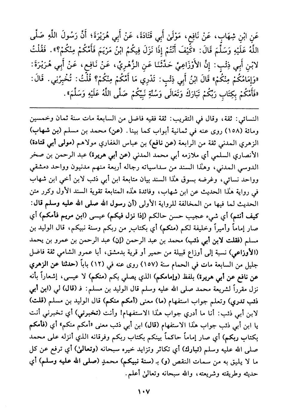 عَنِ ابْنِ شِهَابٍ، عَنْ نَافِعٍ، مَوْلَى أَبِي قَتَادَةَ، عَنْ أَبِي هُرَيرَةَ؛ أَن رَسُولَ اللهِ صَلَّى اللهُ عَلَيهِ وسلَّمَ قَال: "كَيفَ أَنْتُمْ إِذَا نَزَلَ فِيكُمُ ابْنُ مَرْيَمَ فَأَمَّكُمْ مِنْكُمْ؟ ". فَقُلْتُ لابْنِ أَبِي ذِئْبٍ: إِن الأَوْزَاعِيَّ حَدَّثَنَا عَنِ الزُّهْرِيِّ، عَنْ نَافِعٍ، عَنْ أبي هُرَيرَةَ: "وَإِمَامُكُمْ مِنْكُمْ" قَال ابْنُ أَبِي ذِئْبٍ: تَدْرِي مَا أَمَّكُمْ مِنْكُمْ؟ قُلْتُ: تُخْبِرُنِي. قَال: "فَأَمَّكُمْ بِكِتَابِ رَبِّكُمْ تَبَارَكَ وَتَعَالى وَسُنَّةِ نَبِيِّكُمْ صلى الله عَلَيهِ وَسلَّمَ"