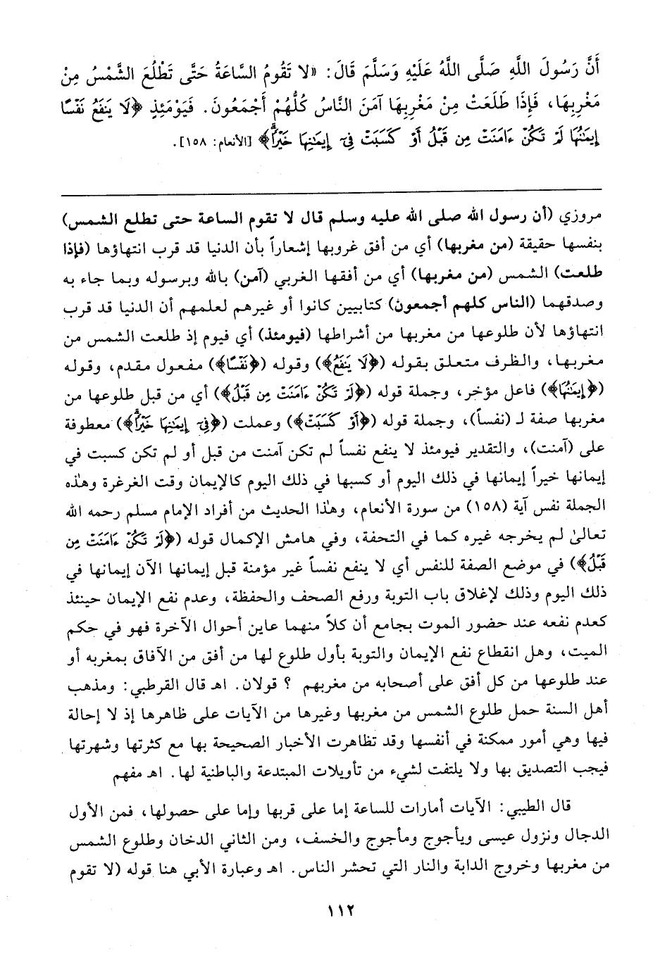 أَنَّ رَسُولَ اللهِ صَلَّى الله عَلَيهِ وَسلَّمَ قَال: "لا تَقُومُ السَّاعةُ حَتَّى تَطْلُعَ الشَّمْسُ مِنْ مَغْرِبِهَا، فَإِذَا طَلَعَتْ مِنْ مَغْرِبِهَا آمَنَ النَّاسُ كُلُّهُمْ أَجْمَعُونَ. فَيَوْمَئِذٍ {لَا يَنْفَعُ نَفْسًا إِيمَانُهَا لَمْ تَكُنْ آمَنَتْ مِنْ قَبْلُ أَوْ كَسَبَتْ فِي إِيمَانِهَا خَيرًا} [الأنعام: ١٥٨]