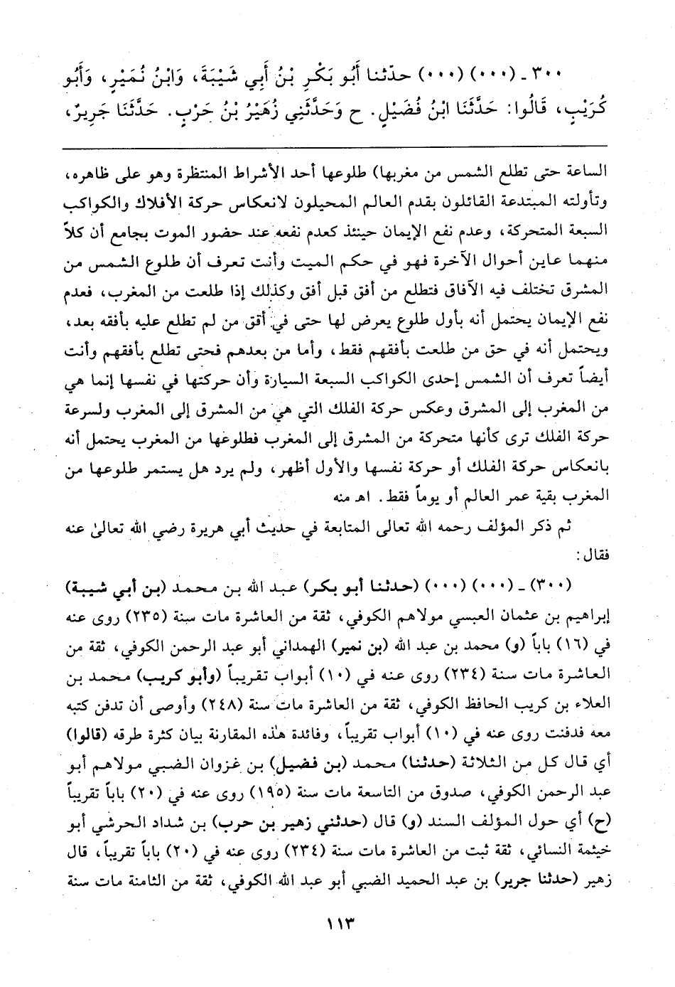 (٣٠٠) - (٠٠) (٠٠) (حدثنا أبو بكر) عبد الله بن محمَّد (بن أبي شيبة) إبراهيم بن عثمان العبسي مولاهم الكُوفيّ، ثِقَة من العاشرة مات سنة (٢٣٥) روى عنه في (١٦) بابا (و) محمَّد بن عبد الله (بن نمير) الهمداني أبو عبد الرَّحْمَن الكُوفيّ، ثِقَة من العاشرة مات سنة (٢٣٤) روى عنه في (١٠) أبواب تقريبًا (وأبو كُريب) محمَّد بن العلاء بن كُريب الحافظ الكُوفيّ، ثِقَة من العاشرة مات سنة (٢٤٨) وأوصى أن تدفن كتبه معه فدفنت روى عنه في (١٠) أبواب تقريبًا، وفائدة هذه المقارنة بيان كثرة طرقه (قالوا) أي قال كل من الثلاثة (حَدَّثَنَا) محمَّد (بن فضيل) بن غزوان الضَّبِّيّ مولاهم أبو عبد الرَّحْمَن الكُوفيّ، صدوق من التاسعة مات سنة (١٩٥) روى عنه في (٢٠) بابًا تقريبًا (ح) أي حول المؤلف السند (و) قال (حَدَّثني زهير بن حرب) بن شداد الحرشي أبو خيثمة النَّسائيّ، ثِقَة ثبت من العاشرة مات سنة (٢٣٤) روى عنه في (٢٠) بابًا تقريبًا، قال زهير (حَدَّثَنَا جرير) بن عبد الحميد الضَّبِّيّ أبو عبد الله. الكُوفيّ، ثِقَة من الثامنة مات سنة