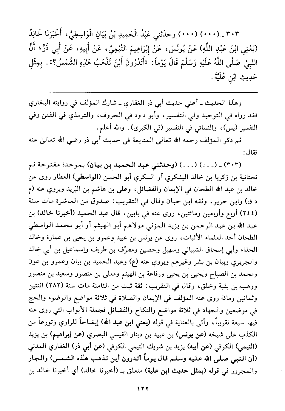 (٣٠٣) - (٠٠) (٠٠) (وحدثني عبد الحميد بن بيان) بموحدة مفتوحة ثم تحتانية بن زكريا بن خالد اليشكري أو السكري أبو الحسن (الواسطيّ) العطار روى عن خالد بن عبد الله الطَّحَّان في الإيمان والفضائل، وعلي بن هاشم بن البَريد ويروي عنه (م دق) وابن جرير، وثقه ابن حبان وقال في التقريب: صدوق من العاشرة مات سنة (٢٤٤) أربع وأربعين ومائتين، روى عنه في بابين، قال عبد الحميد (أخبرنا خالد) بن عبد الله بن عبد الرَّحْمَن بن يزيد المزني مولاهم أبو الهيثم أو أبو محمَّد الواسطيّ الطَّحَّان أحد العلماء الأثبات، روى عن يونس بن عبيد وعمرو بن يحيى بن عمارة وخالد الحذَّاء وأبي إسحاق الشَّيبانِيّ وسهيل وحصين ومطرِّف بن طريف وإسماعيل بن أبي خالد والجريري وبيان بن بشر وغيرهم ويروي عنه (ع) وعبد الحميد بن بيان وعمرو بن عون ومحمَّد بن الصباح ويحيى بن يحيى ورفاعة بن الهيثم ومعلي بن منصور وسعيد بن منصور ووهب بن بقية وخلق، وقال في التقريب: ثِقَة ثبت من الثامنة مات سنة (٢٨٢) اثنتين وثمانين ومائة روى عنه المؤلف في الإيمان والصلاة في ثلاثة مواضع والوضوء والحج في موضعين والجهاد في ثلاثة مواضع والنكاح والفضائل فجملة الأبواب التي روى عنه فيها سبعة تقريبًا، وأتى بالعناية في قوله (يعني ابن عبد الله) إيضاحًا للراوي وتورعًا من الكذب على شيخه (عن يونس) بن عبيد بن دينار القيسي البَصْرِيّ (عن إبراهيم) بن يزيد (التَّيميّ) الكُوفيّ (عن أَبيه) يزيد بن شريك التَّيميّ الكُوفيّ (عن أبي ذر) الغفاري المدنِيُّ (أن النَّبِيّ صلى الله عليه وسلم قال يومًا أتدرون أين تذهب هذه الشَّمس) والجار والمجرور في قوله (بمثل حديث ابن عليّة) متعلق بـ (أخبرنا خالد) أي أخبرنا خالد بن