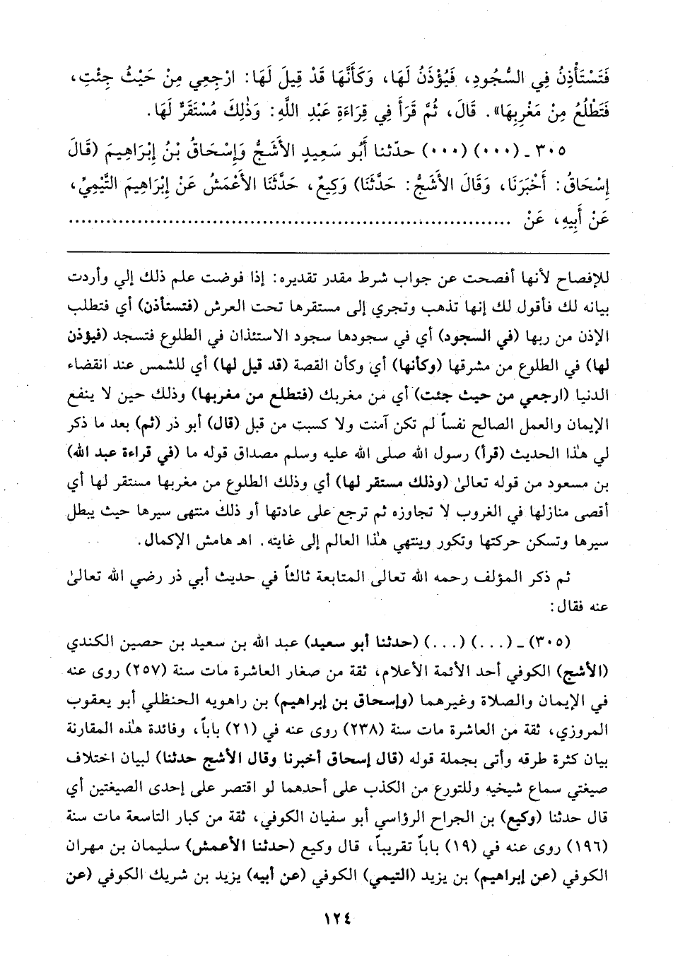(٣٠٥) - (٠٠) (٠٠) (حدثنا أبو سعيد) عبد الله بن سعيد بن حصين الكندي (الأَشَج) الكُوفيّ أحد الأئمة الأعلام، ثِقَة من صغار العاشرة مات سنة (٢٥٧) روى عنه في الإيمان والصلاة وغيرهما (وإسحاق بن إبراهيم) بن راهويه الحنظلي أبو يعقوب المروزي، ثِقَة من العاشرة مات سنة (٢٣٨) روى عنه في (٢١) بابا، وفائدة هذه المقارنة بيان كثرة طرقه وأتى بجملة قوله (قال إسحاق أخبرنا وقال الأَشَج حَدَّثَنَا) لبيان اختلاف صيغتي سماع شيخيه وللتورع من الكذب على أحدهما لو اقتصر على إحدى الصيغتين أي قال حَدَّثَنَا (وكيع) بن الجراح الرؤاسي أبو سفيان الكُوفيّ، ثِقَة من كبار التاسعة مات سنة (١٩٦) روى عنه في (١٩) بابًا تقريبًا، قال وكيع (حَدَّثَنَا الأَعمش) سليمان بن مهران الكُوفيّ (عن إبراهيم) بن يزيد (التَّيميّ) الكُوفيّ (عن أَبيه) يزيد بن شريك الكُوفيّ (عن