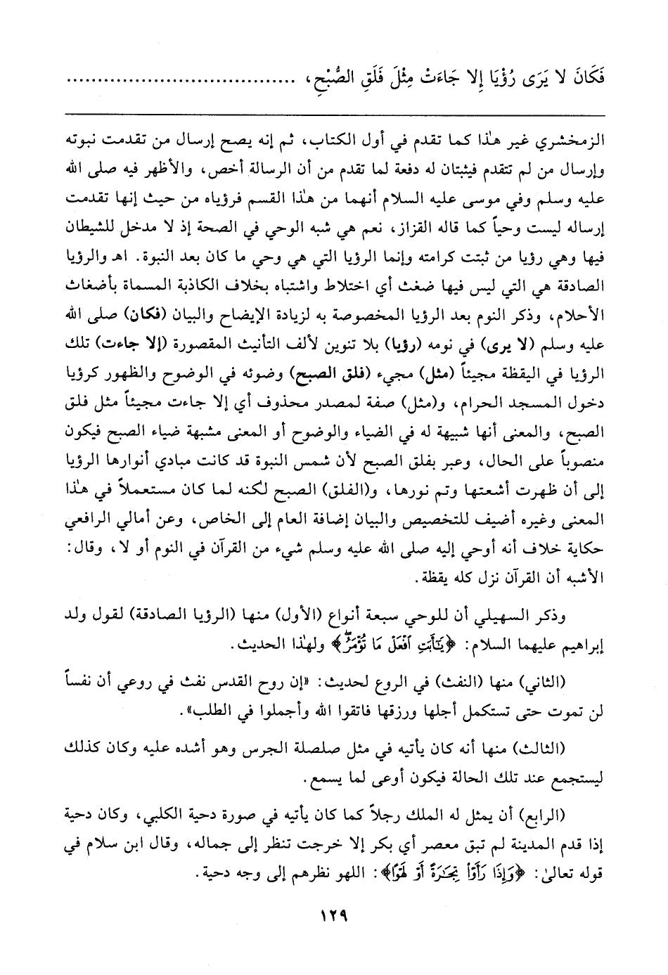 الزمخشري غير هذا كما تقدم في أول الكتاب، ثم إنه يصح إرسال من تقدمت نبوته وإرسال من لم تتقدم فيثبتان له دفعة لما تقدم من أن الرسالة أخص، والأظهر فيه صلى الله عليه وسلم وفي موسى - عليه السلام - أنهما من هذا القسم فرؤياه من حيث إنها تقدمت إرساله ليست وحيًا كما قاله القزاز، نعم هي شبه الوحي في الصحة إذ لا مدخل للشيطان فيها وهي رؤيا من ثبتت كرامته الرؤيا التي هي وحي ما كان بعد النبوة. اهـ والرؤيا الصادقة هي التي ليس فيها ضغث أي اختلاط واشتباه بخلاف الكاذبة المسماة بأضغاث الأحلام، وذكر النوم بعد الرؤيا المخصوصة به لزيادة الإيضاح والبيان (فكان) صلى الله عليه وسلم (لا يرى) في نومه (رؤيا) بلا تنوين لألف التأنيث المقصورة (إلا جاءت) تلك الرؤيا في اليقظة مجيئًا (مثل) مجيء (فلق الصبح) وضوئه في الوضوح والظهور كرؤيا دخول المسجد الحرام، و (مثل) صفة لمصدر محذوف أي إلا جاءت مجيئًا مثل فلق الصبح، والمعنى أنها شبيهة له في الضياء والوضوح أو المعنى مشبهة ضياء الصبح فيكون منصوبًا على الحال، وعبر بفلق الصبح لأن شمس النبوة قد كانت مبادي أنوارها الرؤيا إلى أن ظهرت أشعتها وتم نورها، و (الفلق) الصبح لكنه لما كان مستعملًا في هذا المعنى وغيره أضيف للتخصيص والبيان إضافة العام إلى الخاص، وعن أمالي الرافعي حكاية خلاف أنه أوحي إليه صلى الله عليه وسلم شيء من القرآن في النوم أو لا، وقال: الأشبه أن القرآن نزل كله يقظة.