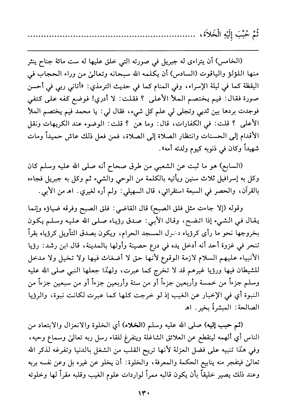 (الخامس) أن يتراءى له جبريل في صورته التي خلق عليها له ست مائة جناح ينثر منها اللؤلؤ والياقوت (السادس) أن يكلمه الله سبحانه وتعالي من وراء الحجاب في اليقظة كما في ليلة الإسراء، وفي المنام كما في حديث الترمذي: "أتاني ربي في أحسن صورة فقال: فيم يختصم الملأ الأعلى؟ فقلت: لا أدري! فوضع كفه على كتفي فوجدت بردها بين ثديي وتجلى لي علم كل شيء، فقال لي: يا محمد فيم يختصم الملأ الأعلى؟ قلت: في الكفارات، قال: وما هن؟ قلت: الوضوء عند الكريهات ونقل الأقدام إلى الحسنات وانتظار الصلاة إلى الصلاة، فمن فعل ذلك عاش حميدًا ومات شهيدًا وكان في ذنوبه كيوم ولدته أمه".