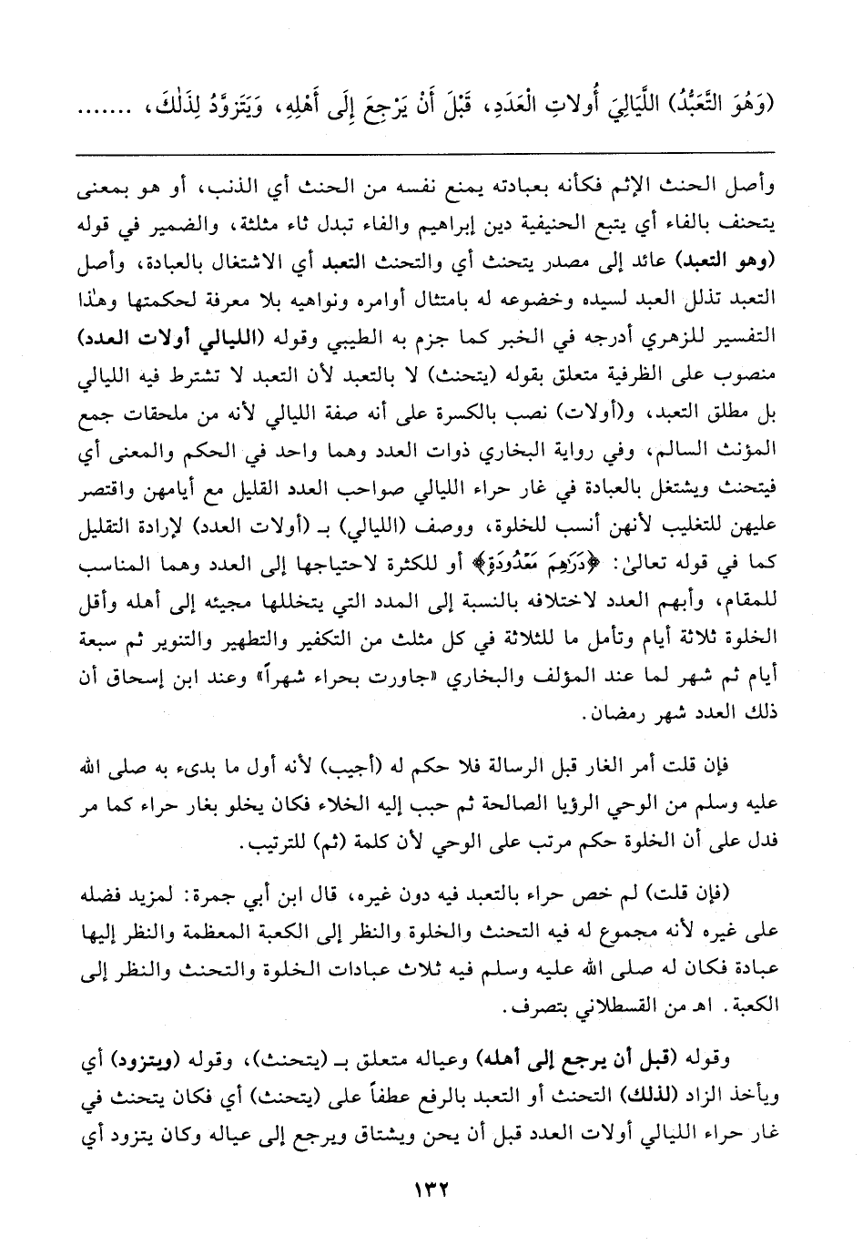 وأصل الحنث الإثم فكأنه بعبادته يمنع نفسه من الحنث أي الذنب، أو هو بمعنى يتحنف بالفاء أي يتبع الحنيفية دين إبراهيم والفاء تبدل ثاء مثلثة، والضمير في قوله (وهو التعبد) عائد إلى مصدر يتحنث أي والتحنث التعبد أي الاشتغال بالعبادة، وأصل التعبد تذلل العبد لسيده وخضوعه له بامتثال أوامره ونواهيه بلا معرفة لحكمتها وهذا التفسير للزهري أدرجه في الخبر كما جزم به الطيبي وقوله (الليالي أولات العدد) منصوب على الظرفية متعلق بقوله (يتحنث) لا بالتعبد لأن التعبد لا تشترط فيه الليالي بل مطلق التعبد، و (أولات) نصب بالكسرة على أنه صفة الليالي لأنه من ملحقات جمع المؤنث السالم، وفي رواية البخاري ذوات العدد وهما واحد في الحكم والمعنى أي فيتحنث ويشتغل بالعبادة في غار حراء الليالي صواحب العدد القليل مع أيامهن واقتصر عليهن للتغليب لأنهن أنسب للخلوة، ووصف (الليالي) بـ (أولات العدد) لإرادة التقليل كما في قوله تعالى: {دَرَاهِمَ مَعْدُودَةٍ} أو للكثرة لاحتياجها إلى العدد وهما المناسب للمقام، وأبهم العدد لاختلافه بالنسبة إلى المدد التي يتخللها مجيئه إلى أهله وأقل الخلوة ثلاثة أيام وتأمل ما للثلاثة في كل مثلث من التكفير والتطهير والتنوير ثم سبعة أيام ثم شهر لما عند المؤلف والبخاري "جاورت بحراء شهرًا" وعند ابن إسحاق أن ذلك العدد شهر رمضان.