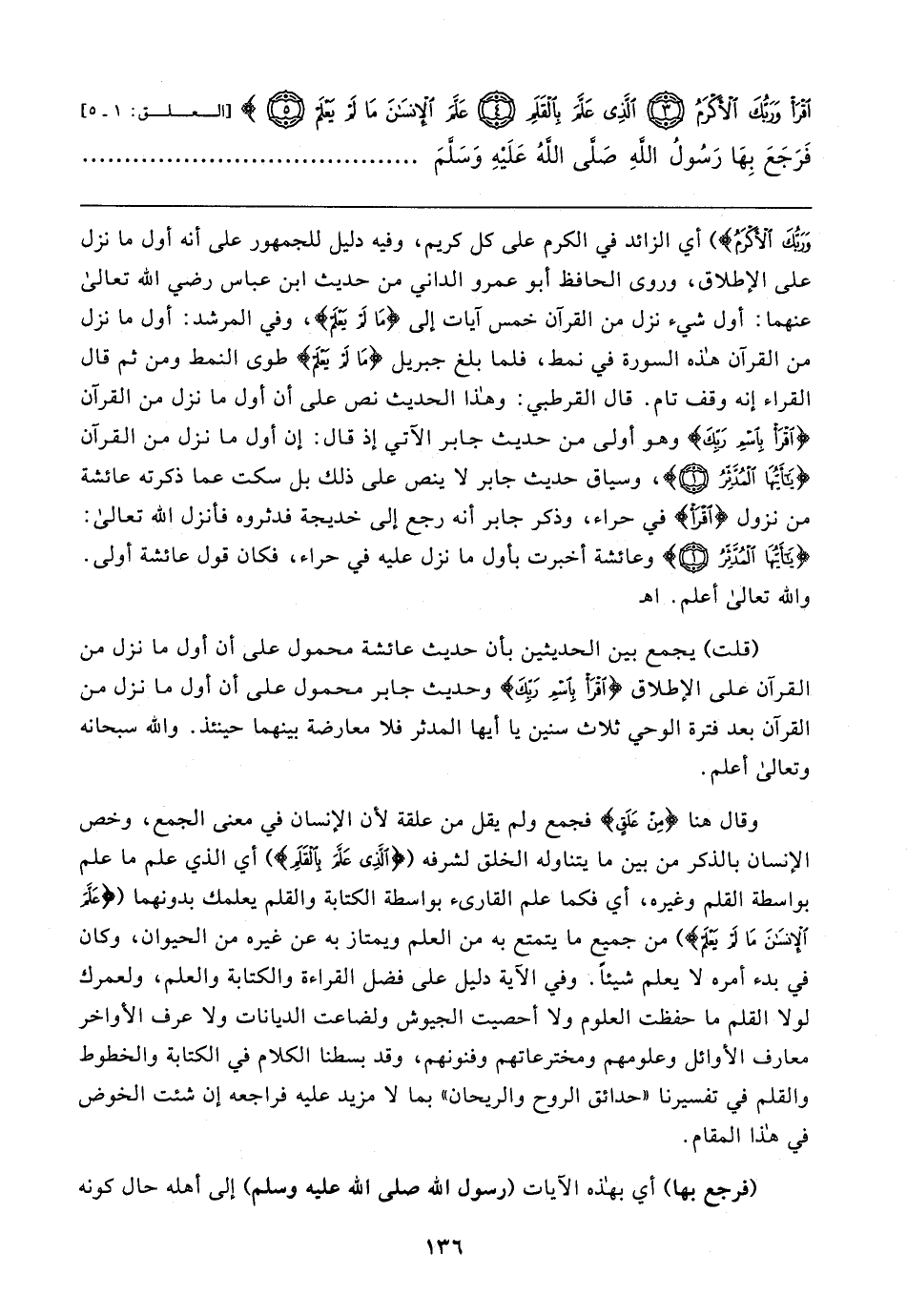 وقال هنا {مِنْ عَلَقٍ} فجمع ولم يقل من علقة لأن الإنسان في معنى الجمع، وخص الإنسان بالذكر من بين ما يتناوله الخلق لشرفه ({الَّذِي عَلَّمَ بِالْقَلَمِ}) أي الذي علم ما علم بواسطة القلم وغيره، أي فكما علم القارئ بواسطة الكتابة والقلم يعلمك بدونهما ({عَلَّمَ الْإِنْسَانَ مَا لَمْ يَعْلَمْ} من جميع ما يتمتع به من العلم ويمتاز به عن غيره من الحيوان، وكان في بدء أمره لا يعلم شيئًا. وفي الآية دليل على فضل القراءة والكتابة والعلم، ولعمرك لولا القلم ما حفظت العلوم ولا أحصيت الجيوش ولضاعت الديانات ولا عرف الأواخر معارف الأوائل وعلومهم ومخترعاتهم وفنونهم، وقد بسطنا الكلام في الكتابة والخطوط والقلم في تفسيرنا "حدائق الروح والريحان" بما لا مزيد عليه فراجعه إن شئت الخوض في هذا المقام.