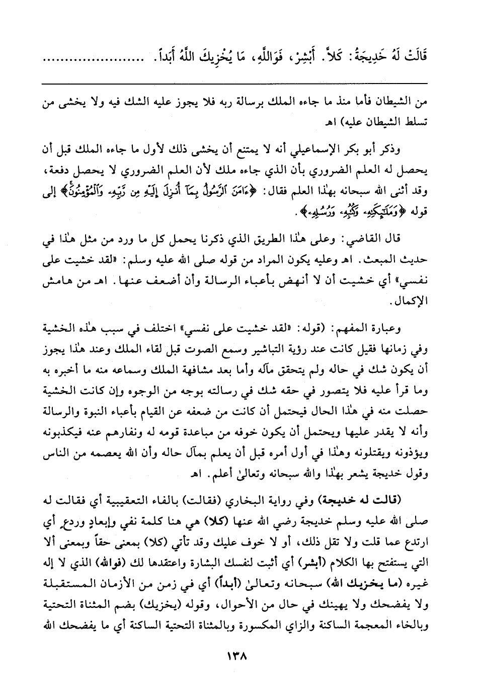 قال القاضي: وعلى هذا الطريق الذي ذكرنا يحمل كل ما ورد من مثل هذا في حديث المبعث. اهـ وعليه يكون المراد من قوله صلى الله عليه وسلم: "لقد خشيت على نفسي" أي خشيت أن لا أنهض باعباء الرسالة وأن أضعف عنها. اهـ من هامش الإكمال.
