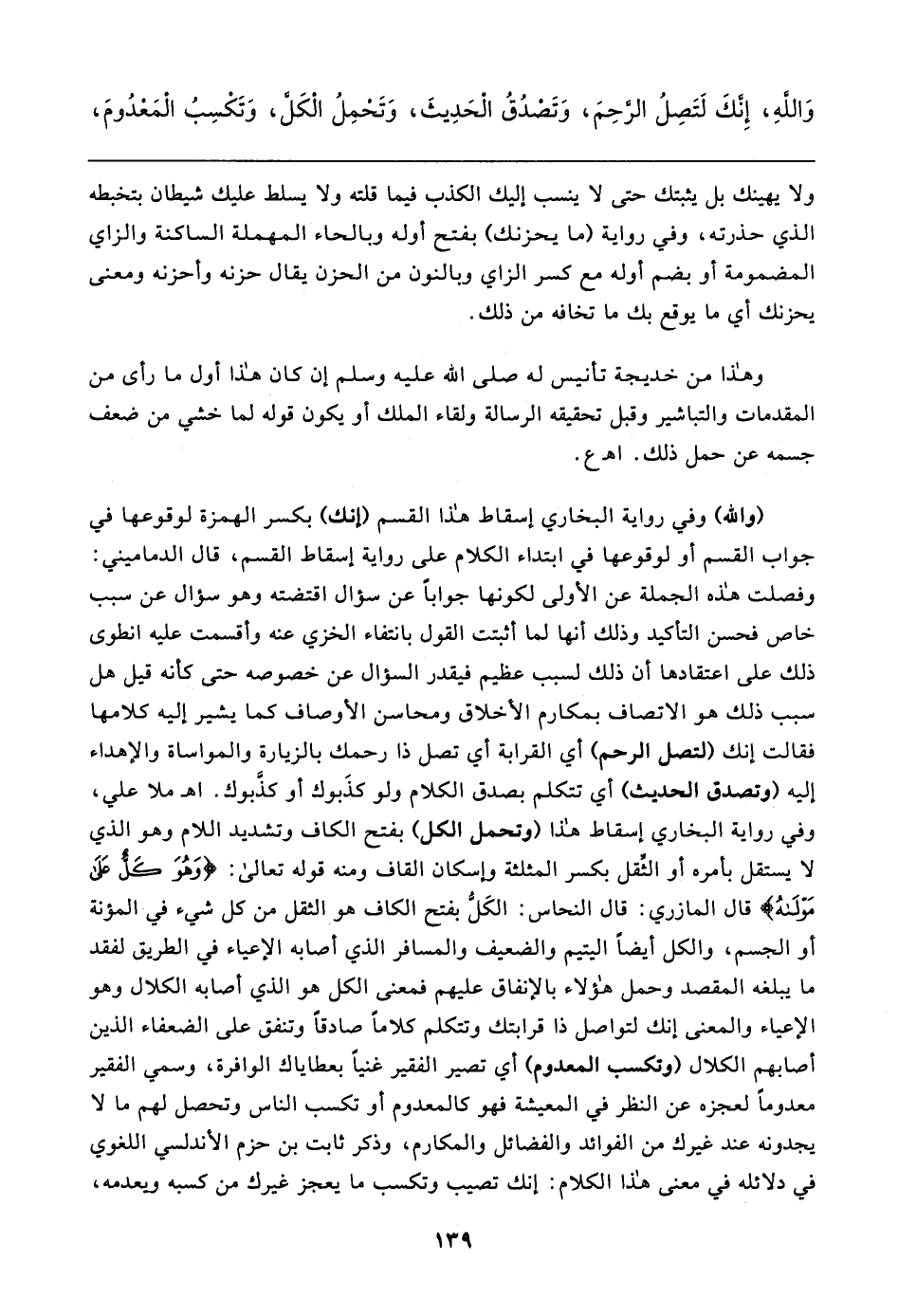(والله) وفي رواية البخاري إسقاط هذا القسم (إنك) بكسر الهمزة لوقوعها في جواب القسم أو لوقوعها في ابتداء الكلام على رواية إسقاط القسم، قال الدماميني: وفصلت هذه الجملة عن الأولى لكونها جوابًا عن سؤال اقتضته وهو سؤال عن سبب خاص فحسن التأكيد وذلك أنها لما أثبتت القول بانتفاء الخزي عنه وأقسمت عليه انطوى ذلك على اعتقادها أن ذلك لسبب عظيم فيقدر السؤال عن خصوصه حتى كأنه قيل هل سبب ذلك هو الاتصاف بمكارم الأخلاق ومحاسن الأوصاف كما يشير إليه كلامها فقالت إنك (لتصل الرحم) أي القرابة أي تصل ذا رحمك بالزيارة والمواساة والإهداء إليه (وتصدق الحديث) أي تتكلم بصدق الكلام ولو كذَبوك أو كذَّبوك. اهـ ملا علي، وفي رواية البخاري إسقاط هذا (وتحمل الكل) بفتح الكاف وتشديد اللام وهو الذي لا يستقل بامره أو الثِّقل بكسر المثلثة وإسكان القاف ومنه قوله تعالى: {وَهُوَ كَلٌّ عَلَى مَوْلَاهُ} قال المازري: قال النحاس: الكَلُّ بفتح الكاف هو الثقل من كل شيء في المؤنة أو الجسم، والكل أيضًا اليتيم والضعيف والمسافر الذي أصابه الإعياء في الطريق لفقد ما يبلغه المقصد وحمل هؤلاء بالإنفاق عليهم فمعنى الكل هو الذي أصابه الكلال وهو الإعياء والمعنى إنك لتواصل ذا قرابتك وتتكلم كلامًا صادقًا وتنفق على الضعفاء الذين أصابهم الكلال (وتكسب المعدوم) أي تصير الفقير غنيًّا بعطاياك الوافرة، وسمي الفقير معدومًا لعجزه عن النظر في المعيشة فهو كالمعدوم أو تكسب الناس وتحصل لهم ما لا يجدونه عند غيرك من الفوائد والفضائل والمكارم، وذكر ثابت بن حزم الأندلسي اللغوي في دلائله في معنى هذا الكلام: إنك تصيب وتكسب ما يعجز غيرك من كسبه ويعدمه،