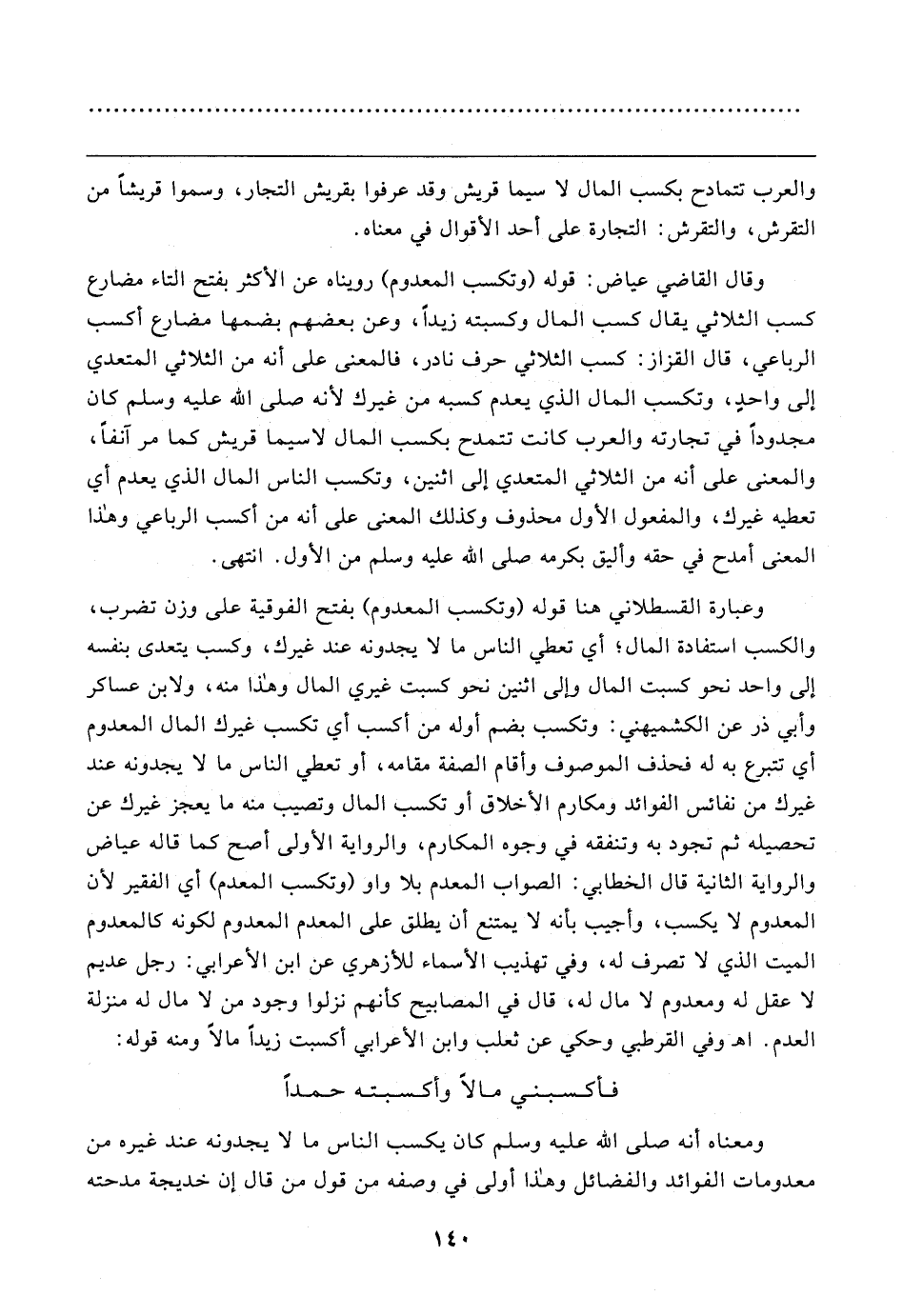 وقال القاضي عياض: قوله (وتكسب المعدوم) رويناه عن الأكثر بفتح التاء مضارع كسب الثلاثي يقال كسب المال وكسبته زيدًا، وعن بعضهم بضمها مضارع أكسب الرباعي، قال القزاز: كسب الثلاثي حرف نادر، فالمعنى على أنه من الثلاثي المتعدي إلى واحدٍ، وتكسب المال الذي يعدم كسبه من غيرك لأنه صلى الله عليه وسلم كان مجدودًا في تجارته والعرب كانت تتمدح بكسب المال لاسيما قريش كما مر آنفًا، والمعنى على أنه من الثلاثي المتعدي إلى اثنين، وتكسب الناس المال الذي يعدم أي تعطيه غيرك، والمفعول الأول محذوف وكذلك المعنى على أنه من أكسب الرباعي وهذا المعنى أمدح في حقه وأليق بكرمه صلى الله عليه وسلم من الأول. انتهى.