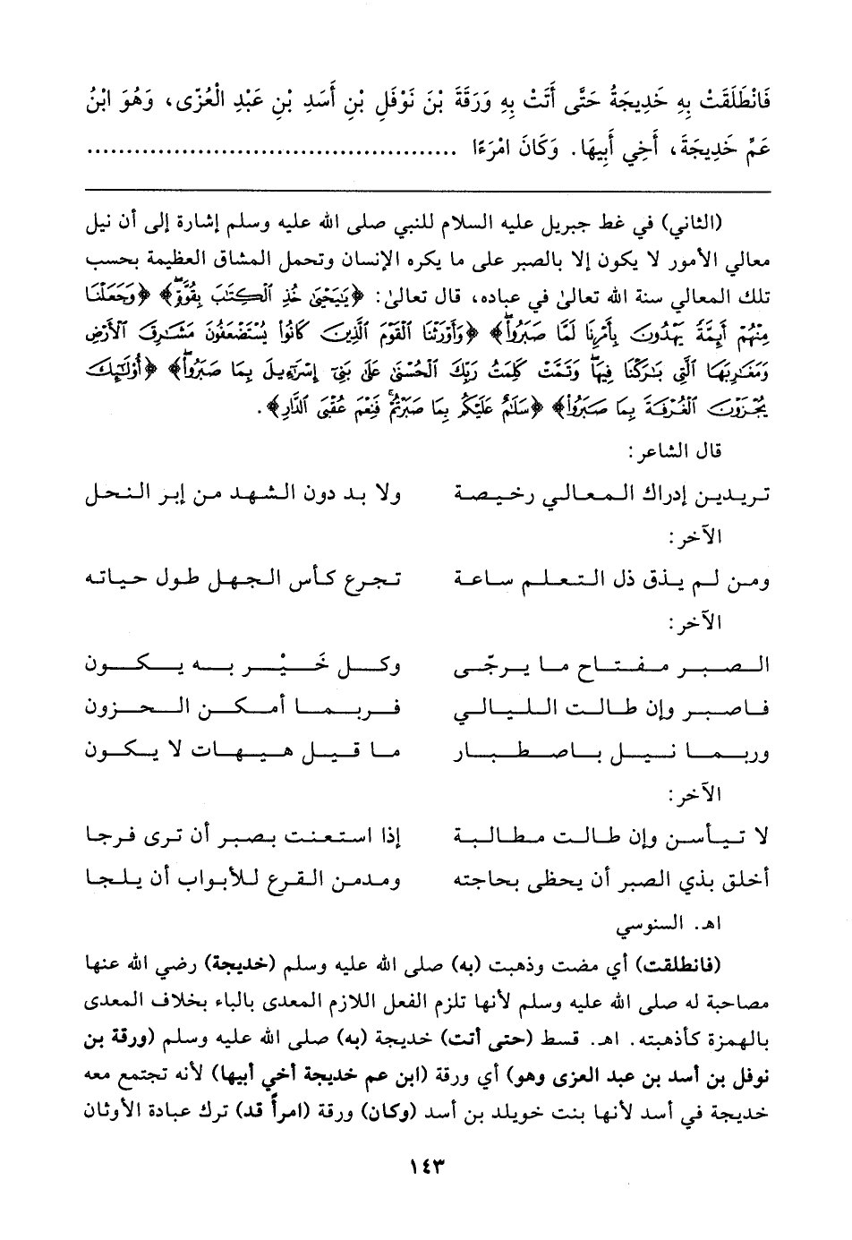 (الثاني) في غط جبريل - عليه السلام - للنبي صلى الله عليه وسلم إشارة إلى أن نيل معالي الأمور لا يكون إلا بالصبر على ما يكره الإنسان وتحمل المشاق العظيمة بحسب تلك المعالي سنة الله تعالى في عباده، قال تعالى: {يَايَحْيَى خُذِ الْكِتَابَ بِقُوَّةٍ} {وَجَعَلْنَا مِنْهُمْ أَئِمَّةً يَهْدُونَ بِأَمْرِنَا لَمَّا صَبَرُوا} {وَأَوْرَثْنَا الْقَوْمَ الَّذِينَ كَانُوا يُسْتَضْعَفُونَ مَشَارِقَ الْأَرْضِ وَمَغَارِبَهَا الَّتِي بَارَكْنَا فِيهَا وَتَمَّتْ كَلِمَتُ رَبِّكَ الْحُسْنَى عَلَى بَنِي إِسْرَائِيلَ بِمَا صَبَرُوا} {أُولَئِكَ يُجْزَوْنَ الْغُرْفَةَ بِمَا صَبَرُوا} {سَلَامٌ عَلَيكُمْ بِمَا صَبَرْتُمْ فَنِعْمَ عُقْبَى الدَّارِ}.