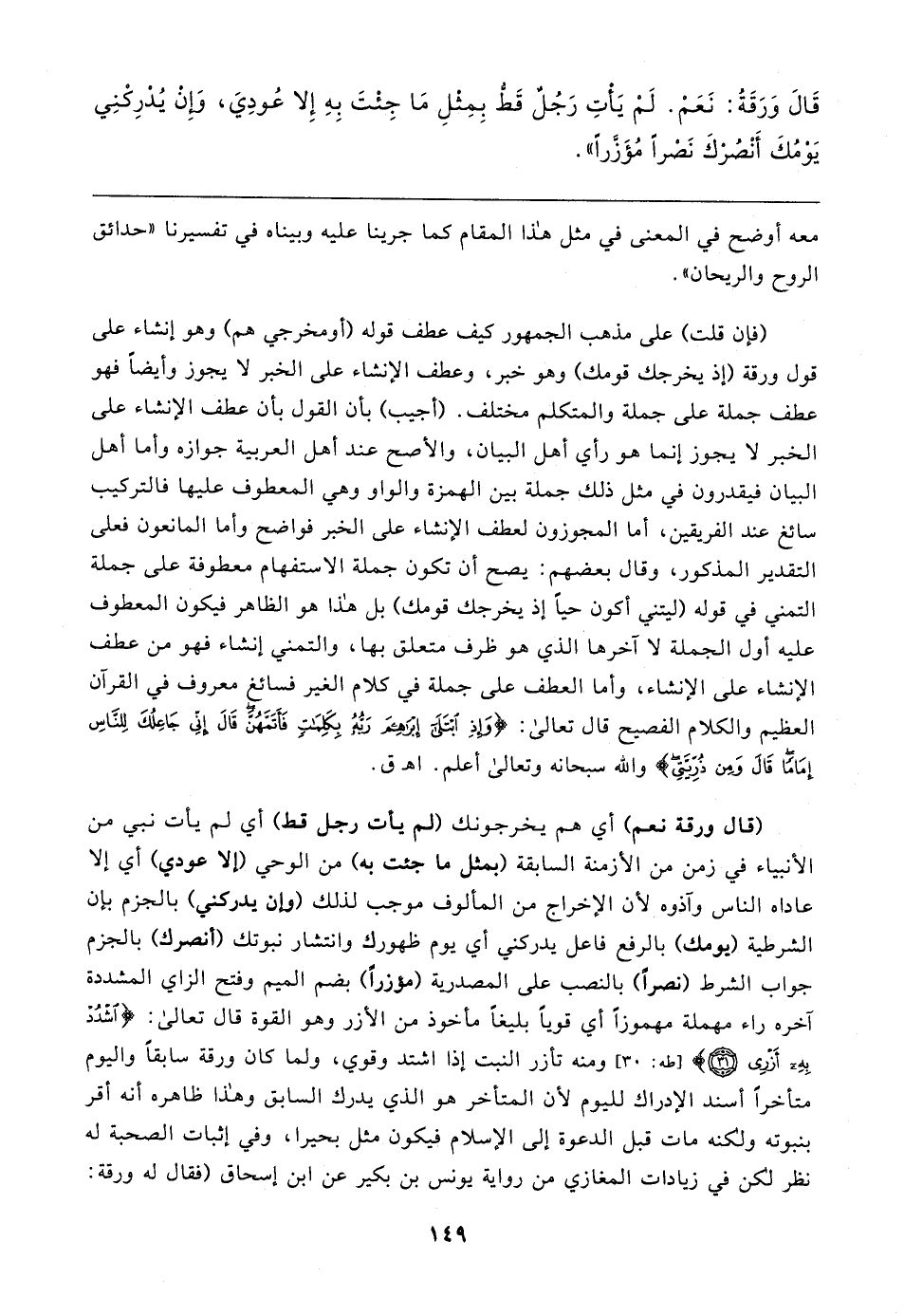 (فإن قلت) على مذهب الجمهور كيف عطف قوله (أو مخرجي هم) وهو إنشاء على قول ورقة (إذ يخرجك قومك) وهو خبر، وعطف الإنشاء على الخبر لا يجوز وأيضًا فهو عطف جملة على جملة والمتكلم مختلف. (أجيب) بأن القول بأن عطف الإنشاء على الخبر لا يجوز إنما هو رأي أهل البيان، والأصح عند أهل العربية جوازه وأما أهل البيان فيقدرون في مثل ذلك جملة بين الهمزة والواو وهي المعطوف عليها فالتركيب سائغ عند الفريقين، أما المجوزون لعطف الإنشاء على الخبر فواضح وأما المانعون فعلى التقدير المذكور، وقال بعضهم: يصح أن تكون جملة الاستفهام معطوفة على جملة التمني في قوله (ليتني أكون حيًّا إذ يخرجك قومك) بل هذا هو الظاهر فيكون المعطوف عليه أول الجملة لا آخرها الذي هو ظرف متعلق بها، والتمني إنشاء فهو من عطف الإنشاء على الإنشاء، وأما العطف على جملة في كلام الغير فسائغ معروف في القرآن العظيم والكلام الفصيح قال تعالي: {وَإِذِ ابْتَلَى إِبْرَاهِيمَ رَبُّهُ بِكَلِمَاتٍ فَأَتَمَّهُنَّ قَال إِنِّي جَاعِلُكَ لِلنَّاسِ إِمَامًا قَال وَمِنْ ذُرِّيَّتِي} والله سبحانه وتعالي أعلم. اهـ ق.
