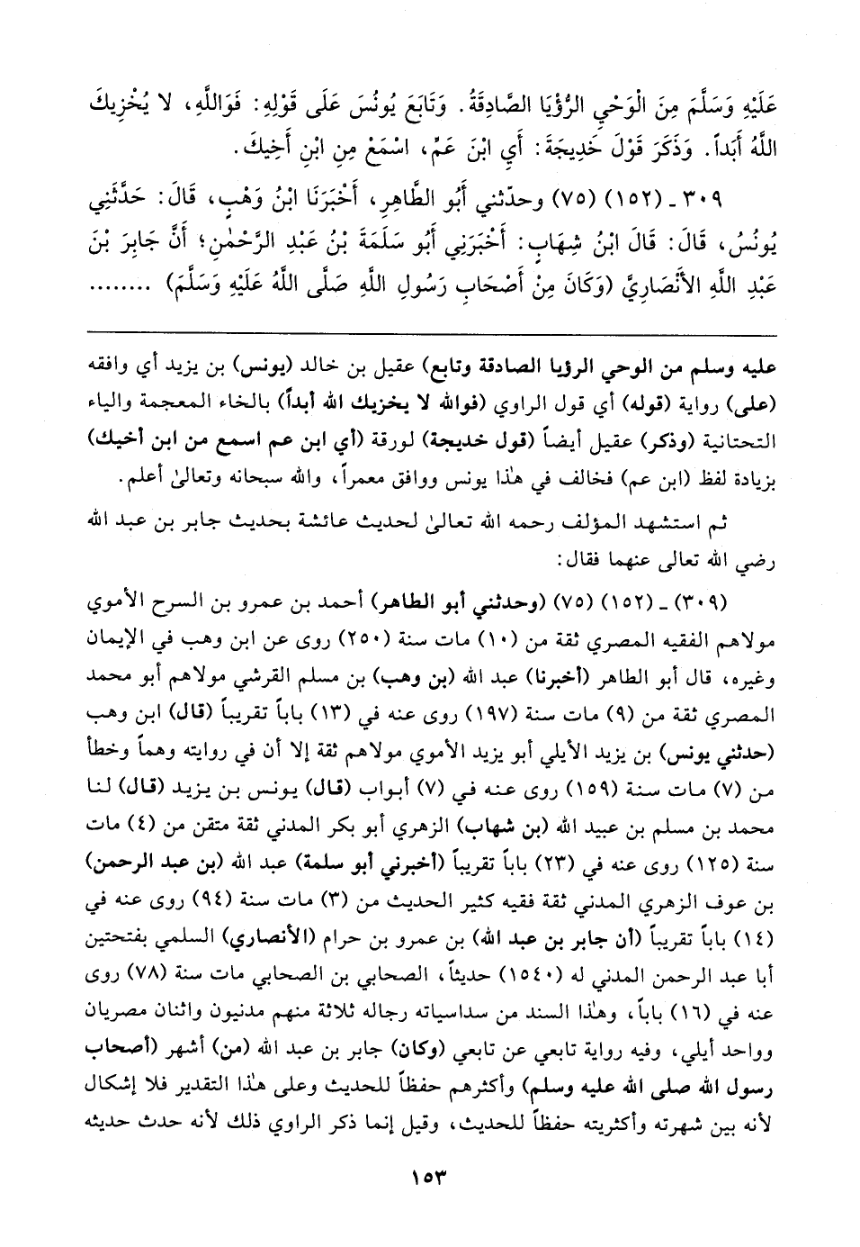 (٣٠٩) - (١٥٢) (٧٥) (وحدثني أبو الطاهر) أحمد بن عمرو بن السرح الأموي مولاهم الفقيه المصري ثقة من (١٠) مات سنة (٢٥٠) روى عن ابن وهب في الإيمان وغيره، قال أبو الطاهر (أخبرنا) عبد الله (بن وهب) بن مسلم القرشي مولاهم أبو محمد المصري ثقة من (٩) مات سنة (١٩٧) روى عنه في (١٣) بابًا تقريبًا (قال) ابن وهب (حدثني يونس) بن يزيد الأيلي أبو يزيد الأموي مولاهم ثقة إلا أن في روايته وهمًا وخطأ من (٧) مات سنة (١٥٩) روى عنه في (٧) أبواب (قال) يونس بن يزيد (قال) لنا محمد بن مسلم بن عبيد الله (بن شهاب) الزهري أبو بكر المدني ثقة متقن من (٤) مات سنة (١٢٥) روى عنه في (٢٣) بابًا تقريبًا (أخبرني أبو سلمة) عبد الله (بن عبد الرحمن) بن عوف الزهري المدني ثقة فقيه كثير الحديث من (٣) مات سنة (٩٤) روى عنه في (١٤) بابًا تقريبًا (أن جابر بن عبد الله) بن عمرو بن حرام (الأنصاري) السلمي بفتحتين أبا عبد الرحمن المدني له (١٥٤٠) حديثًا، الصحابي بن الصحابي مات سنة (٧٨) روى عنه في (١٦) بابا، وهذا السند من سداسياته رجاله ثلاثة منهم مدنيون واثنان مصريان وواحد أيلي، وفيه رواية تابعي عن تابعي (وكان) جابر بن عبد الله (من) أشهر (أصحاب رسول الله صلى الله عليه وسلم) وأكثرهم حفظًا للحديث وعلى هذا التقدير فلا إشكال لأنه بين شهرته وأكثريته حفظًا للحديث، وقيل إنما ذكر الراوي ذلك لأنه حدث حديثه