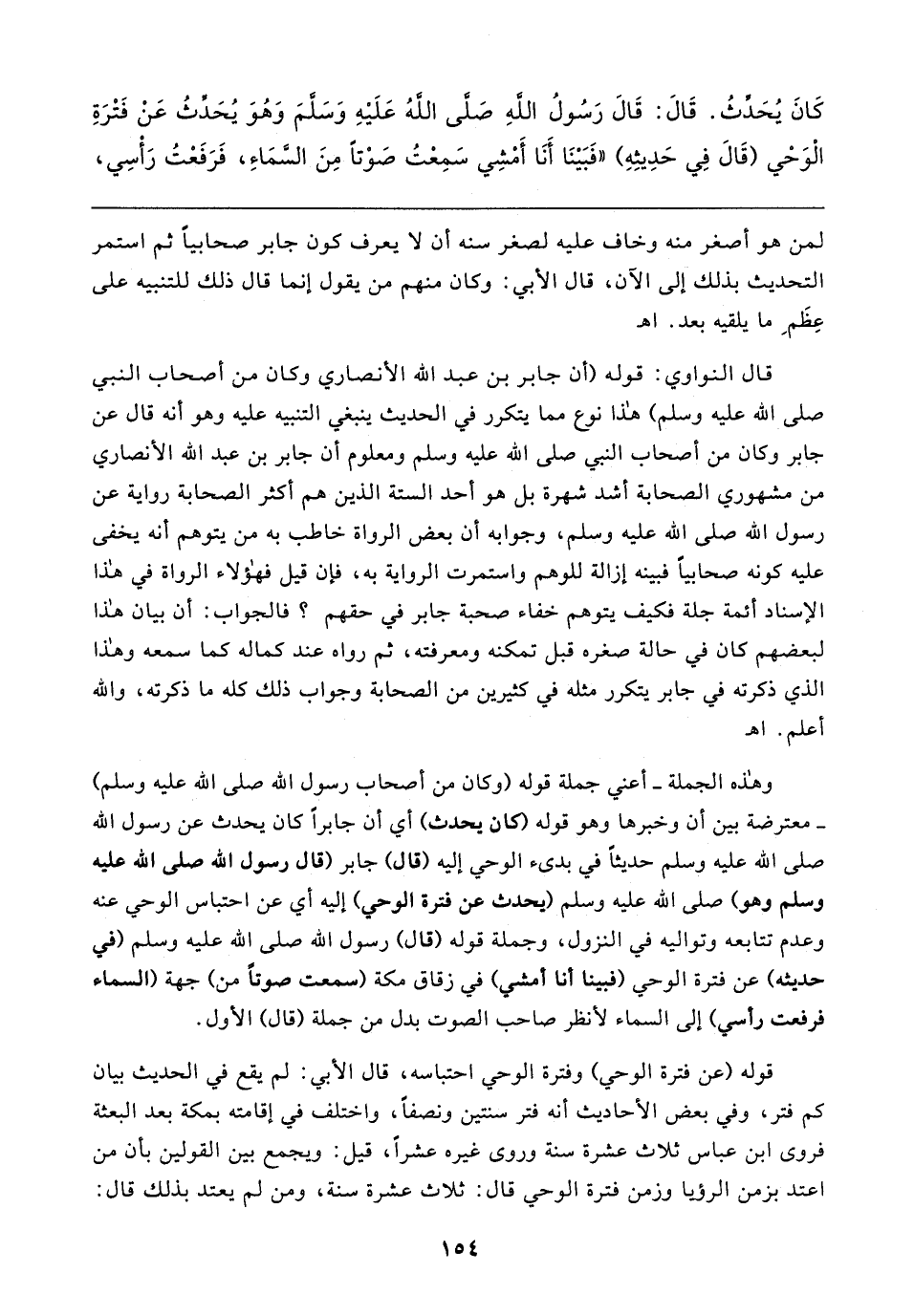 وهذه الجملة -أعني جملة قوله (وكان من أصحاب رسول الله صلى الله عليه وسلم) - معترضة بين أن وخبرها وهو قوله كان يحدث) أي أن جابرًا كان يحدث عن رسول الله صلى الله عليه وسلم حديثًا في بدئ الوحي إليه (قال) جابر (قال رسول الله صلى الله عليه وسلم وهو) صلى الله عليه وسلم (يحدث عن فترة الوحي) إليه أي عن احتباس الوحي عنه وعدم تتابعه وتواليه في النزول، وجملة قوله (قال) رسول الله صلى الله عليه وسلم (في حديثه) عن فترة الوحي (فبينا أنا أمشي) في زقاق مكة (سمعت صوتًا من) جهة (السماء فرفعت رأسي) إلى السماء لأنظر صاحب الصوت بدل من جملة (قال) الأول.