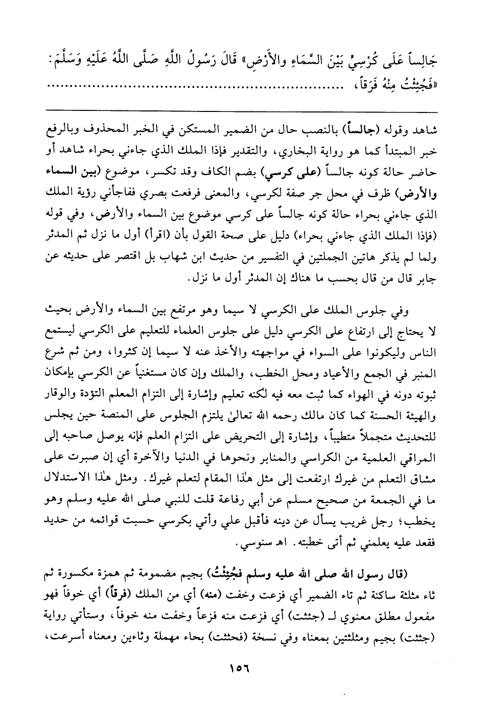 وفي جلوس الملك على الكرسي لا سيما وهو مرتفع بين السماء والأرض بحيث لا يحتاج إلى ارتفاع على الكرسي دليل على جلوس العلماء للتعليم على الكرسي ليستمع الناس وليكونوا على السواء في مواجهته والأخذ عنه لا سيما إن كثروا، ومن ثم شرع المنبر في الجمع والأعياد ومحل الخطب، والملك وإن كان مستغنيًا عن الكرسي بإمكان ثبوته دونه في الهواء كما ثبت معه فيه لكنه تعليم وإشارة إلى التزام المعلم التؤدة والوقار والهيئة الحسنة كما كان مالك رحمه الله تعالى يلتزم الجلوس على المنصة حين يجلس للتحديث متجملًا متطيبًا، وإشارة إلى التحريض على التزام العلم فإنه يوصل صاحبه إلى المراقي العلمية من الكراسي والمنابر ونحوها في الدنيا والآخرة أي إن صبرت على مشاق التعلم من غيرك ارتفعت إلى مثل هذا المقام لتعلم غيرك. ومثل هذا الاستدلال ما في الجمعة من صحيح مسلم عن أبي رفاعة قلت للنبي صلى الله عليه وسلم وهو يخطب؛ رجل غريب يسأل عن دينه فأقبل علي وأتي بكرسي حسبت قوائمه من حديد فقعد عليه يعلمني ثم أتى خطبته. اهـ سنوسي.