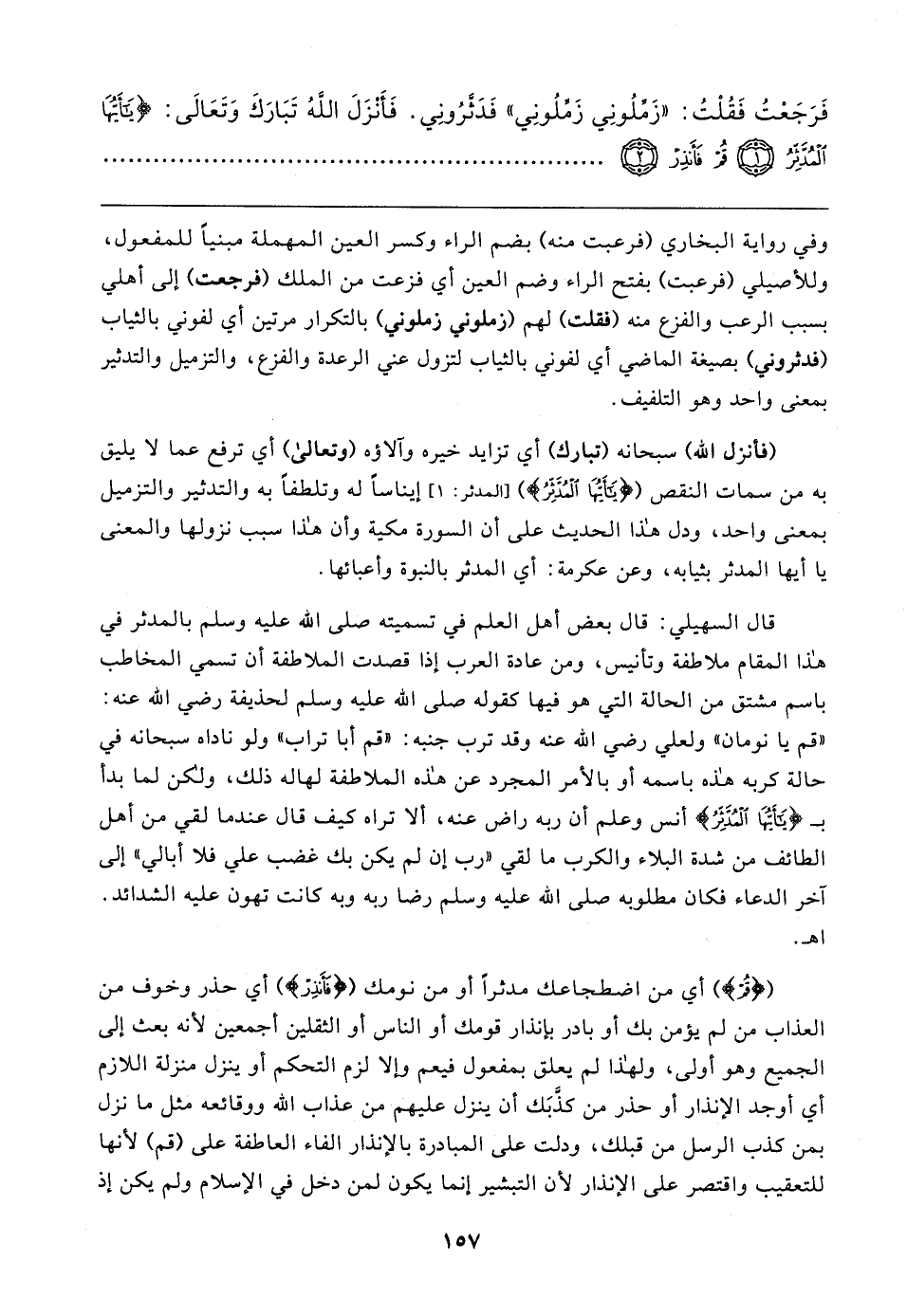 (فأنزل الله) سبحانه (تبارك) أي تزايد خيره وآلاؤه (وتعالى) أي ترفع عما لا يليق به من سمات النقص {يَا أَيُّهَا الْمُدَّثِّرُ} [المدثر: ١] إيناسًا له وتلطفًا به والتدثير والتزميل بمعنى واحد، ودل هذا الحديث على أن السورة مكية وأن هذا سبب نزولها والمعنى يا أيها المدثر بثيابه، وعن عكرمة: أي المدثر بالنبوة وأعبائها.