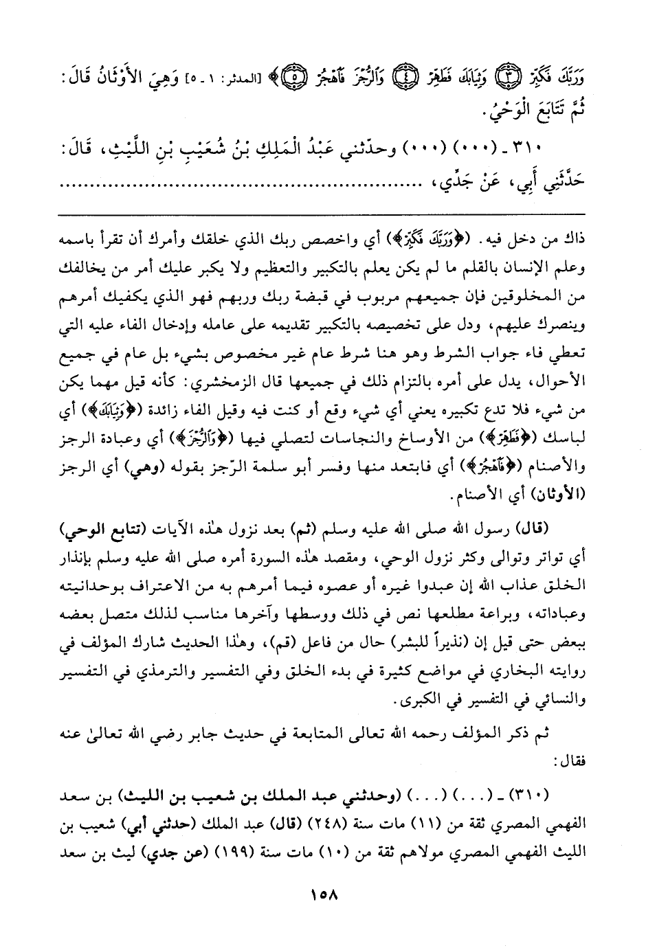 ذاك من دخل فيه. {وَرَبَّكَ فَكَبِّرْ}) أي واخصص ربك الذي خلقك وأمرك أن تقرأ باسمه وعلم الإنسان بالقلم ما لم يكن يعلم بالتكبير والتعظيم ولا يكبر عليك أمر من يخالفك من المخلوقين فإن جميعهم مربوب في قبضة ربك وربهم فهو الذي يكفيك أمرهم وينصرك عليهم، ودل على تخصيصه بالتكبير تقديمه على عامله وإدخال الفاء عليه التي تعطي فاء جواب الشرط وهو هنا شرط عام غير مخصوص بشيء بل عام في جميع الأحوال، يدل على أمره بالتزام ذلك في جميعها قال الزمخشري: كأنه قيل مهما يكن من شيء فلا تدع تكبيره يعني أي شيء وقع أو كنت فيه وقيل الفاء زائدة ({وَثِيَابَكَ}) أي لباسك ({فَطَهِّرْ}) من الأوساخ والنجاسات لتصلي فيها ({وَالرُّجْزَ}) أي وعبادة الرجز والأصنام ({فَاهْجُرْ}) أي فابتعد منها وفسر أبو سلمة الرّجز بقوله (وهي) أي الرجز (الأوثان) أي الأصنام.