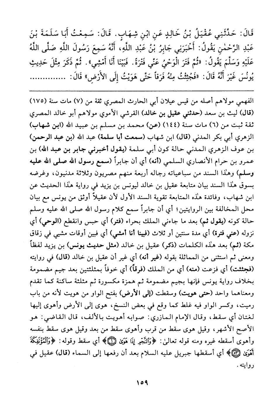 قَال: حَدَّثَنِي عُقْيَلُ بْنُ خَالِدٍ عَنِ ابْنِ شِهَابٍ. قَال: سَمِعْتُ أَبَا سَلَمَةَ بْنَ عَبْدِ الرَّحْمْنِ يَقُولُ: أَخْبَرَنِي جَابِرُ بْنُ عَبْدِ اللهِ، أَنهُ سَمِعَ رَسُولَ اللهِ صَلَّى اللهُ عَلَيهِ وَسَلَّمَ يَقُولُ: "ثُمَّ فَتَرَ الْوَحْيُ عَنِّي فَتْرَةً. فَبَينَا أَنَا أَمْشِي". ثُمَّ ذَكَرَ مِثْلَ حَدِيثِ يُونُسَ غَيرَ أَنهُ قَال: "فَجُثِثْتُ مِنْهُ فَرَقًا حَتَّى هَوَيتُ إِلَى الأَرْضِ" قَال: