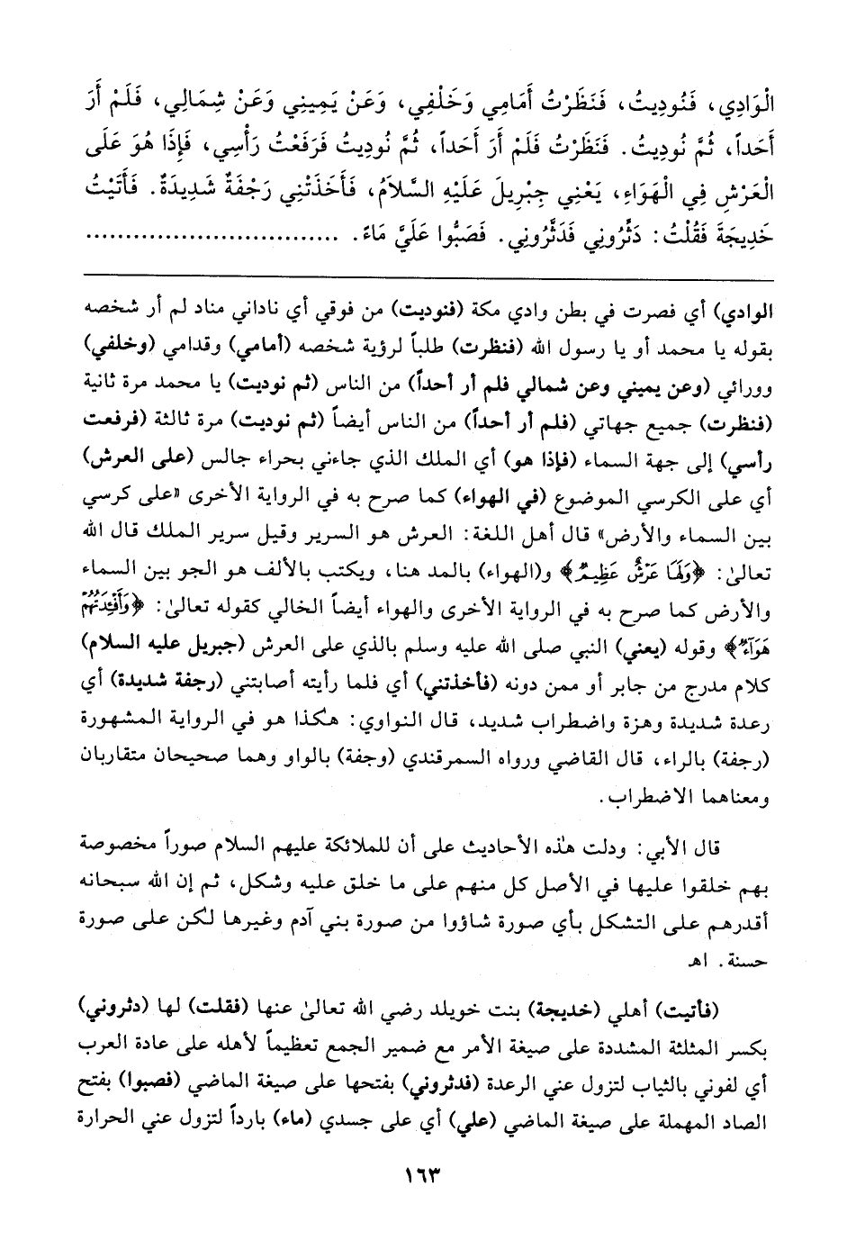 الْوَادِي، فَنُودِيتُ، فَنَظَرْتُ أَمَامِي وَخَلْفِي، وَعَنْ يَمِينِي وَعَنْ شِمَالِي، فَلَمْ أَرَ أَحَدًا، ثُم نُودِيتُ. فَنَظَرْتُ فَلَمْ أَرَ أَحَدًا، ثُمَّ نُودِيتُ فَرَفَعْتُ رَأْسِي، فَإِذَا هُوَ عَلَى الْعَرْشِ فِي الْهَوَاءِ، يَعْنِي جِبْرِيلَ عَلَيهِ السَّلَامُ، فَأَخَذَتْنِي رَجْفَةٌ شَدِيدَةٌ. فَأَتَيتُ خَدِيجَةَ فَقُلْتُ: دَثِّرُوني فَدَثَّرُوني. فَصَبُّوا عَلَيَّ مَاءً