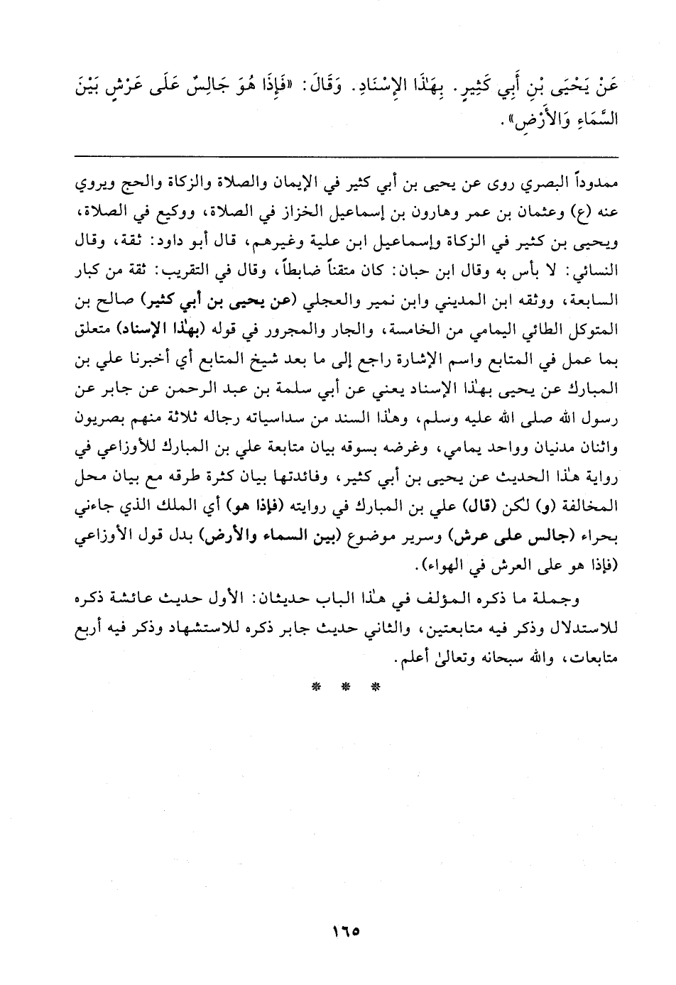 عَنْ يَحْيَى بْنِ أَبِي كَثِيرٍ. بِهَذَا الإِسْنَادِ. وَقَال: "فَإِذَا هُوَ جَالِسٌ عَلَى عَرْشٍ بَينَ السَّمَاءِ وَالأَرْضِ"