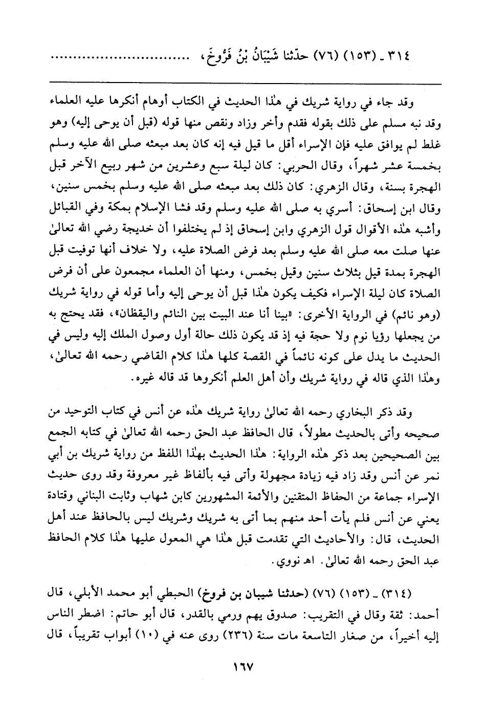 وقد ذكر البخاري رحمه الله تعالى رواية شريك هذه عن أنس في كتاب التوحيد من صحيحه وأتى بالحديث مطولًا، قال الحافظ عبد الحق رحمه الله تعالى في كتابه الجمع بين الصحيحين بعد ذكر هذه الرواية: هذا الحديث بهذا اللفظ من رواية شريك بن أبي نمر عن أنس وقد زاد فيه زيادة مجهولة وأتى فيه بالفاظ غير معروفة وقد روى حديث الإسراء جماعة من الحفاظ المتقنين والأئمة المشهورين كابن شهاب وثابت البناني وقتادة يعني عن أنس فلم يأت أحد منهم بما أتى به شريك وشريك ليس بالحافظ عند أهل الحديث، قال: والأحاديث التي تقدمت قبل هذا هي المعول عليها هذا كلام الحافظ عبد الحق رحمه الله تعالى. اهـ نووي.