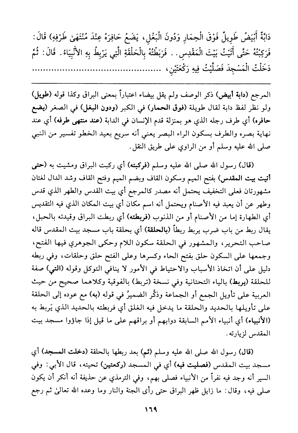 دَابَّةٌ أَبْيَضُ طَويلٌ فَوْقَ الْحِمَارِ وَدُونَ الْبَغْلِ، يَضَعُ حَافِرَهُ عِنْدَ مُنْتَهَى طَرْفِهِ) قَال: فَرَكِبْتُهُ حَتَّى أَتَيتُ بَيتَ الْمَقْدِسِ .. فَرَبَطْتُهُ بِالْحَلْقَةِ الَّتِي يَرْبِطُ بِهِ الأَنْبِيَاءُ. قَال: ثُمَّ دَخَلْتُ الْمَسْجِدَ فَصَلَّيتُ فِيهِ رَكْعَتَينِ،