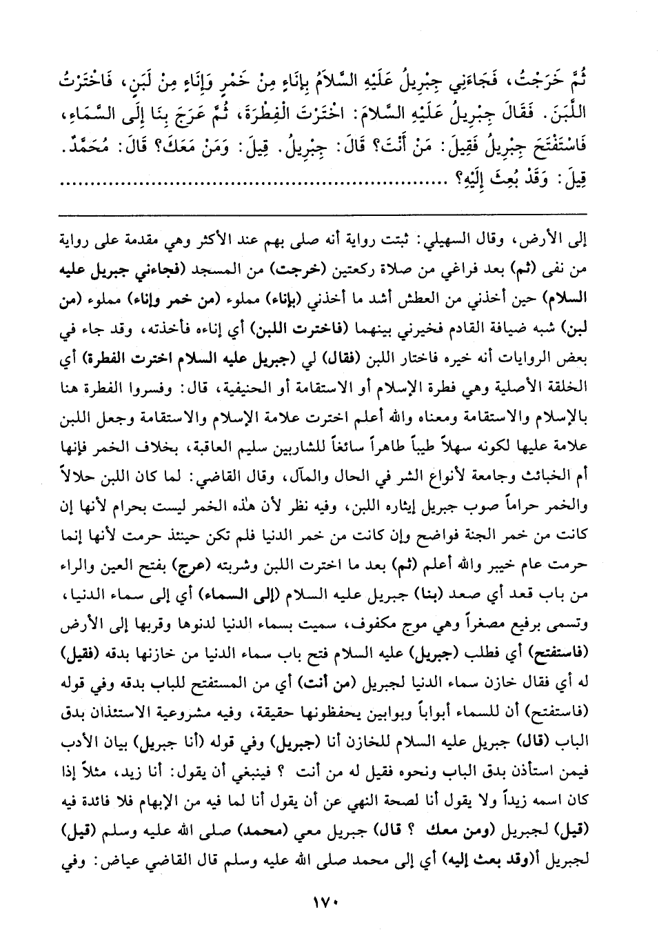 ثُمَّ خَرَجْتُ، فَجَاءَنِي جِبْرِيلُ عَلَيهِ السَّلامُ بِإنَاءٍ مِنْ خَمْرِ وَإِنَاءٍ مِنْ لَبَنٍ، فَاختَرْتُ اللَّبَنَ. فَقَال جِبْرِيلُ عَلَيهِ السَّلامَ: اخْتَرْتَ الْفِطرَةَ، ثُمَّ عَرَجَ بِنَا إِلَى السَّمَاءِ، فَاسْتَفْتَحَ جِبْرِيلُ فَقِيلَ: مَنْ أَنْتَ؟ قَال: جِبْرِيلُ. قِيلَ: وَمَنْ مَعَكَ؟ قَال: مُحَمَّدٌ. قِيلَ: وَقَدْ بُعِثَ إِلَيهِ؟