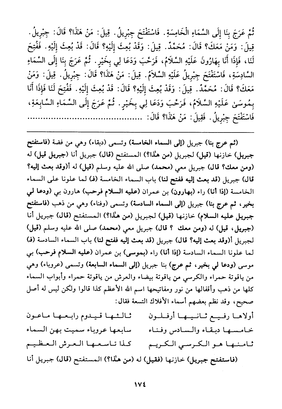 ثُمَّ عَرَجَ بِنَا إِلَى السَّمَاءِ الْخَامِسَةِ. فَاسْتَفْتَحَ جِبرِيلُ. قِيلَ: مَنْ هَذَا؟ قَال: جِبْرِيلُ. قِيلَ: وَمَنْ مَعَكَ؟ قَال: مُحَمَّدٌ. قِيلَ: وَقَدْ بُعِثَ إِلَيهِ؟ قَال: قَدْ بُعِثَ إِلَيهِ. فَفُتِحَ لَنَا، فَإِذَا أَنَا بِهَارُونَ عَلَيهِ السَّلامُ، فَرَحَّبَ وَدَعَا لِي بِخَيبر. ثُمَّ عَرَجَ بِنَا إِلَى السَّمَاءِ السَّادِسَةِ، فَاسْتَفْتَحَ جِبْرِيلُ عَلَيهِ السَّلامُ. قِيلَ: مَنْ هَذَا؟ قَال: جِبْرِيلُ. قِيلَ: وَمَنْ مَعَكَ؟ قَال: مُحَمَّدٌ. قِيلَ: وَقَدْ بُعِثَ إِلَيهِ؟ قَال: قَدْ بُعِثَ إِلَيهِ. فَفُتِحَ لَنَا فَإِذَا أَنَا بِمُوسَى عَلَيهِ السَّلامُ، فَرَحَّبَ وَدَعَا لِي بِخَيرٍ. ثُمَّ عَرَجَ إِلَى السَّمَاءِ السَّابِعَةِ، فَاسْتَفْتَحَ جِبْرِيلُ. فَقِيلَ: مَنْ هَذَا؟ قَال: