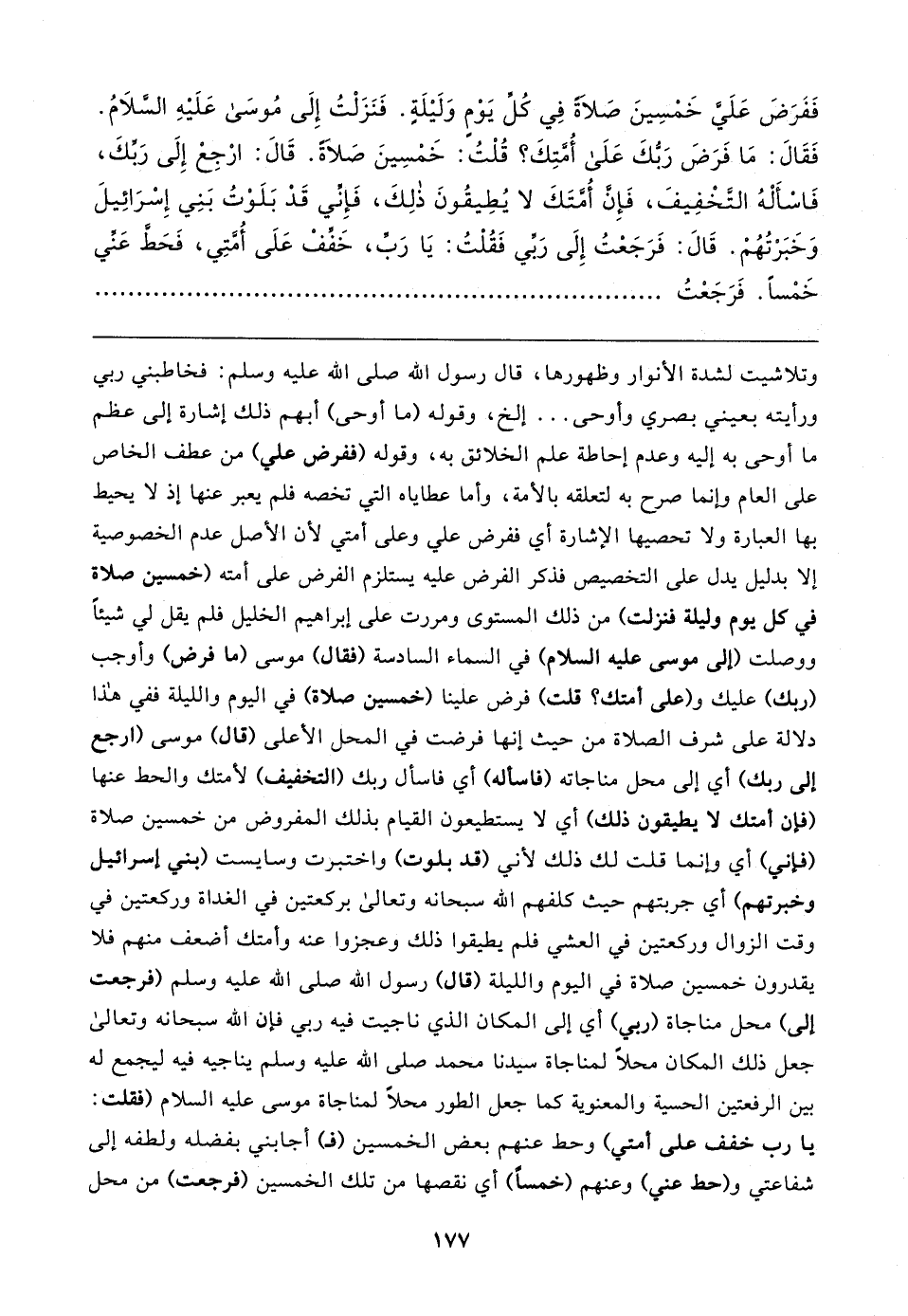 فَفَرَضَ عَلَيَّ خَمْسِينَ صَلاةً فِي كُلِّ يَوْمٍ وَلَيلَةٍ. فَنَزَلْتُ إِلَى مُوسَى عَلَيهِ السَّلامُ. فَقَال: مَا فَرَضَ رَبُّكَ عَلَى أُمَّتِكَ؟ قُلْتُ: خَمْسِينَ صَلاةً. قَال: ارْجِعْ إِلَى رَبِّكَ، فَاسْأَلْهُ التَّخْفِيفَ، فَإِن أُمَّتَكَ لا يُطِيقُونَ ذلِكَ، فَإِنِّي قَدْ بَلَوْتُ بَنِي إِسْرَائِيلَ وَخَبَرْتُهُمْ. قَال: فَرَجَعْتُ إِلَى رَبِّي فَقُلْتُ: يَا رَبِّ، خَفِّفْ عَلَى أُمَّتِي، فَحَط عَنِّي خَمْسًا. فَرَجَعْتُ